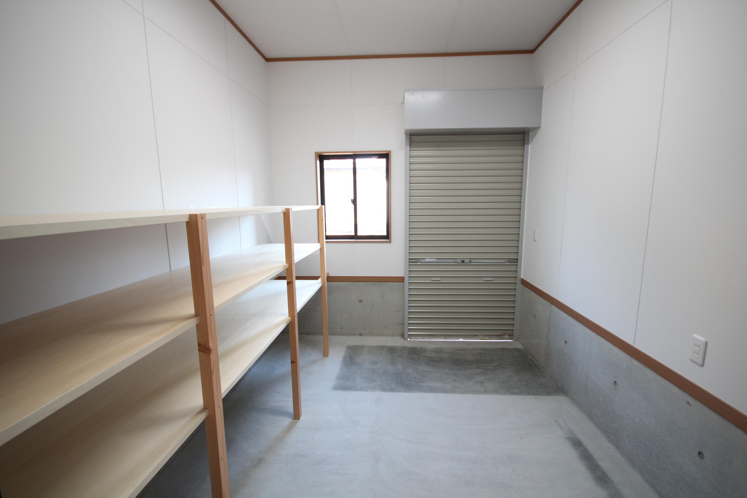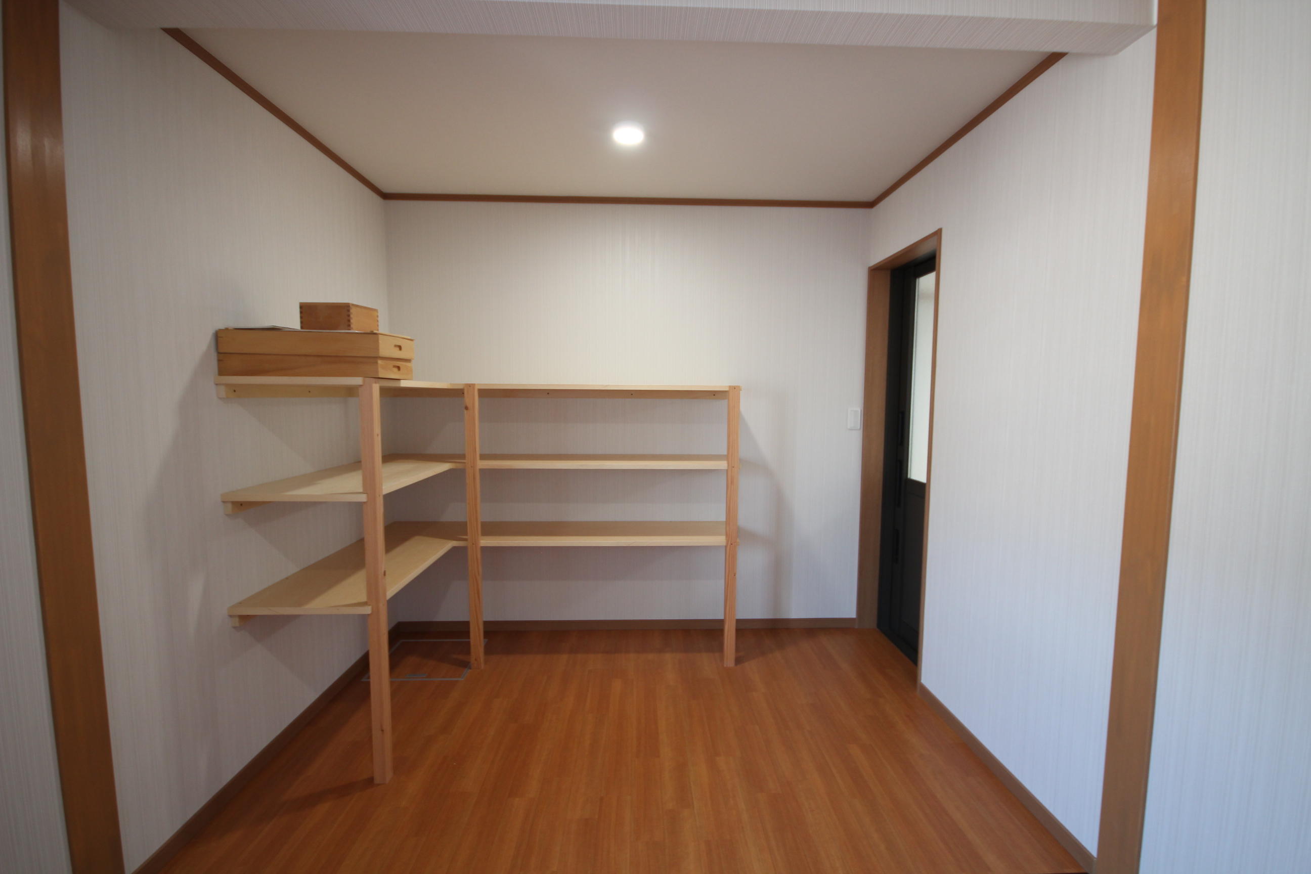 外物置から直接行き来ができる野菜保管庫。こちらもT様のご希望で収穫した野菜を仕舞って置ける棚を造作しています。