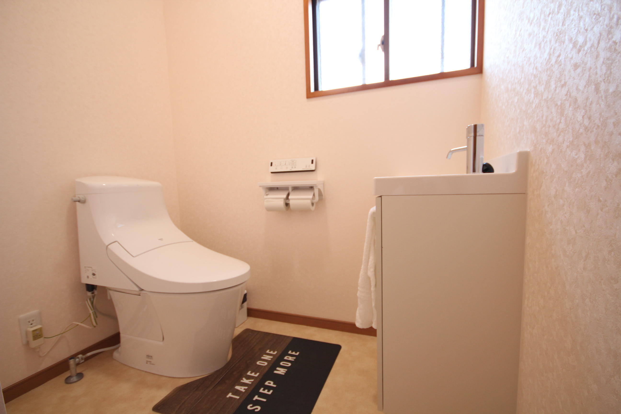 既存の小便器を撤去し、面積が広くなったトイレには新たに手洗い洗面台を設置しました。トイレの便器は汚れを楽に落とせる「アクアセラミック」製で、お掃除も簡単です!
