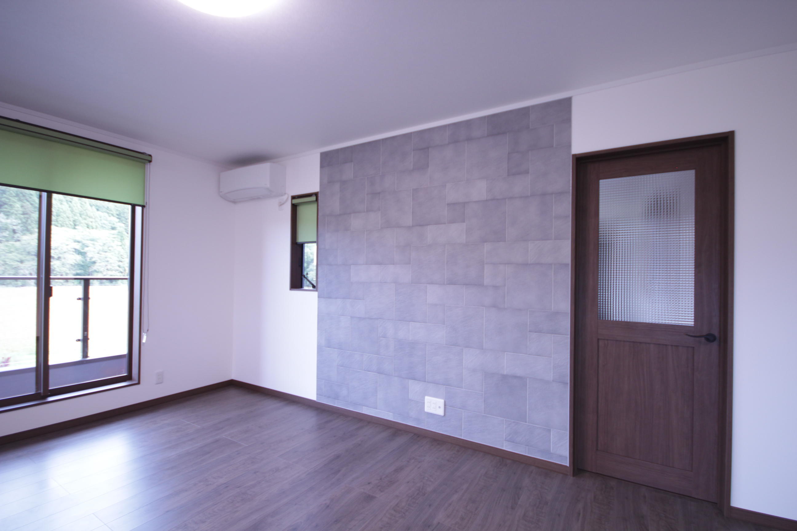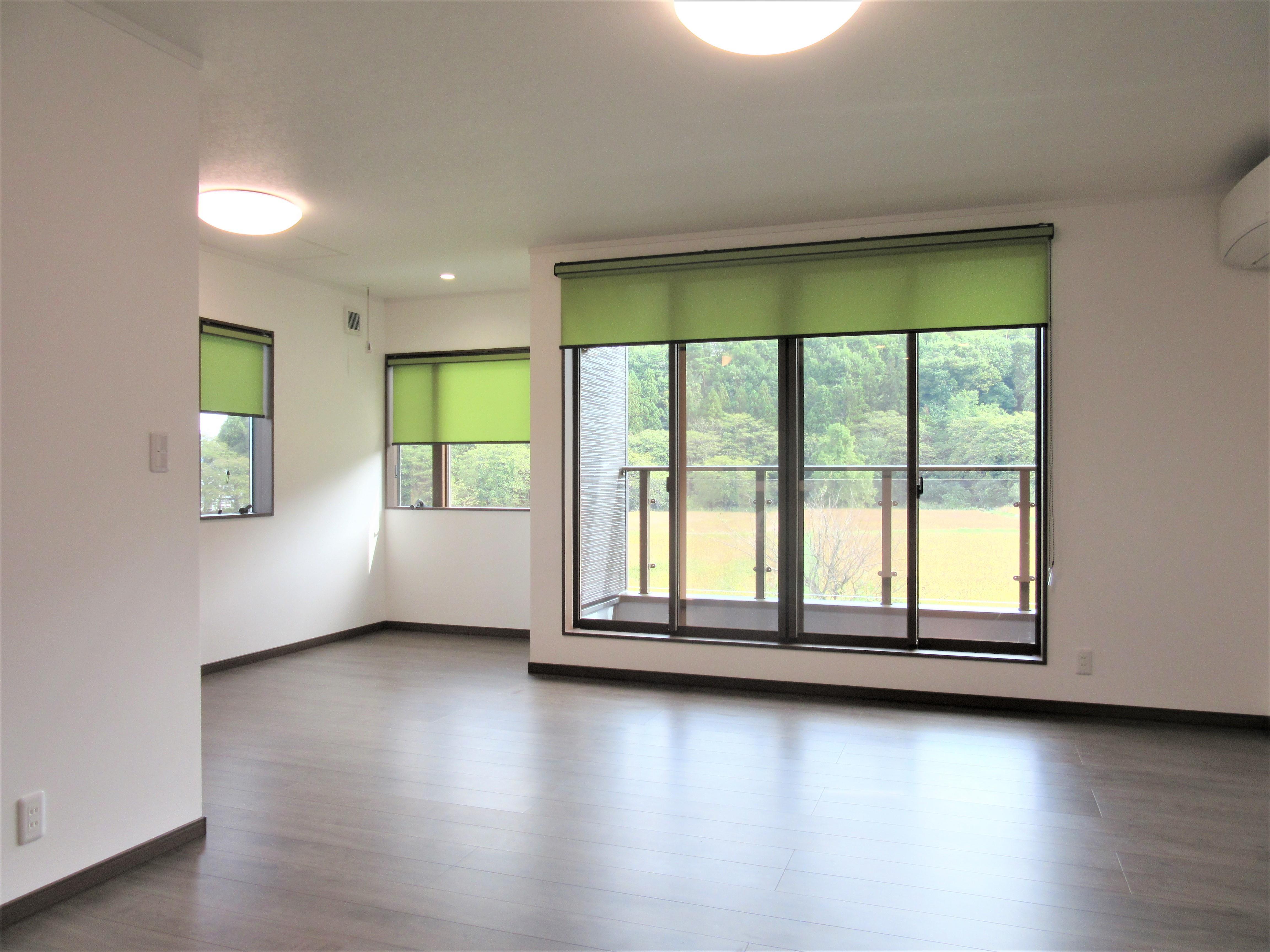 大きな窓から光をたくさん取り込めるリビング。クロスに白、ロールスクリーンには緑を採用し、リラックスできる爽やかな空間になりました。天井や壁は断熱材の入れ替えを行い、冬も夏も快適にお過ごしいただけます。