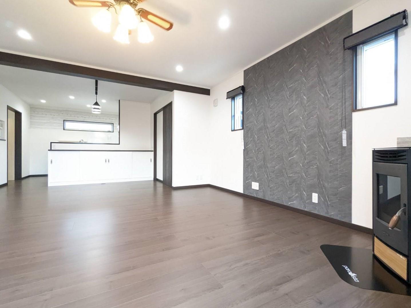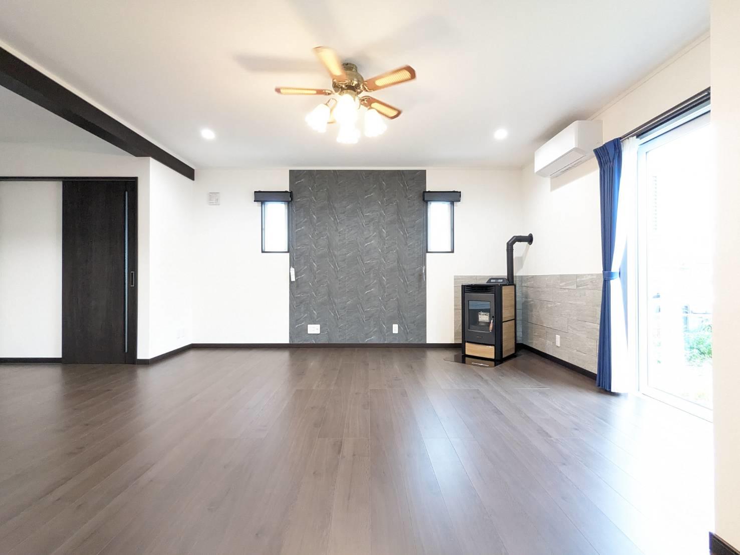 リビングと客間を解体し、間取りを変更して広々25.0帖のLDKを実現! お施主様こだわりのペレットストーブは、環境にも優しく、空気をぽかぽかと温めてくれます♪ 既存のシーリングファンライトを使用し、以前のお住まいの思い出と雰囲気を残しました。