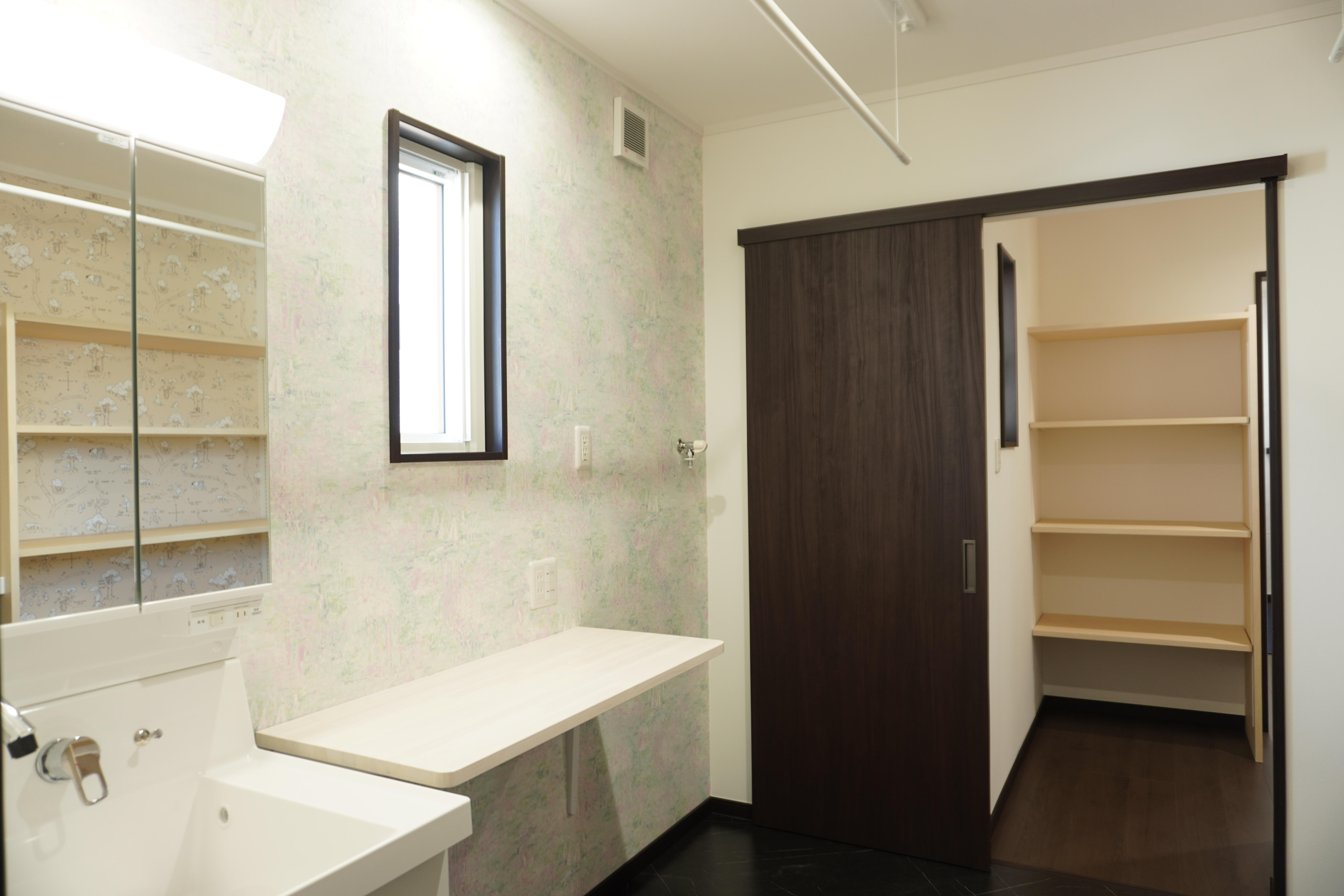 洗面スペースは収納面や家事のしやすさにこだわりました。キッチンからパントリー、洗面室、脱衣室への連続した動線が、使い勝手のいい間取りとなっています。洗濯機置き場の隣にはカウンターを設置し、洗濯物のたたみや仕分け、アイロンがけなど、様々な作業に利用していただけます。反対側には収納スペースがあり、洗濯物をすぐにしまうこともでき、家事を効率的に行えるようになっています!
