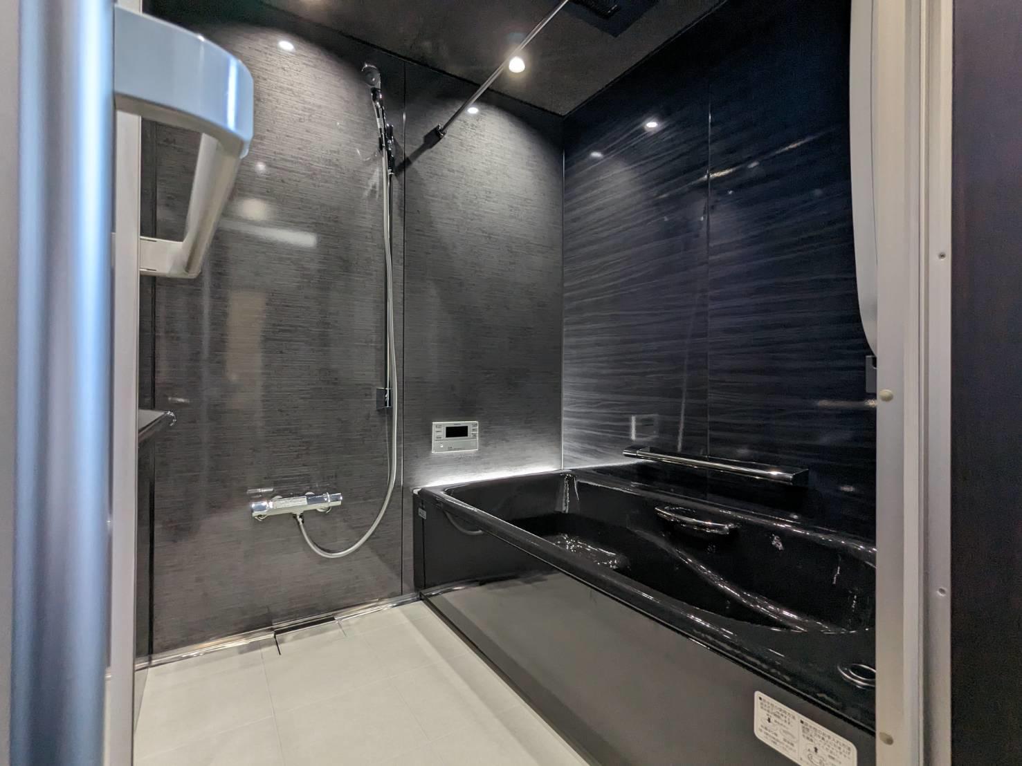 浴室には、タカラスタンダードの最高級バスルーム『PREDENCIAプレデンシア』の1616サイズを採用しました。 こちらの浴室の最大の魅力は「鋳物ホーロー浴槽」です!ベースが金属でできているため、浴槽自体が熱を蓄える性質があります。そのため、お湯の熱と浴槽からのダブル温浴効果を得ることができ、体の芯までぽかぽかと暖かさを感じられます♪ 浴室パネルもホーロー製なので、マグネットを使用した収納が可能です!シャンプーボトルや掃除道具などを壁にかけて収納でき、自由に位置調整ができるため、使い勝手抜群です。ボトル底部分のヌメリに悩まされることがなくなります。 プレデンシアは、ホーロー浴槽の快適さ、美しさ、清潔さを兼ね備えています。浴槽の前には間接照明を設置し、深みのある色調と光沢のあるブラックの仕上げで、リラックスできる空間が完成しました!