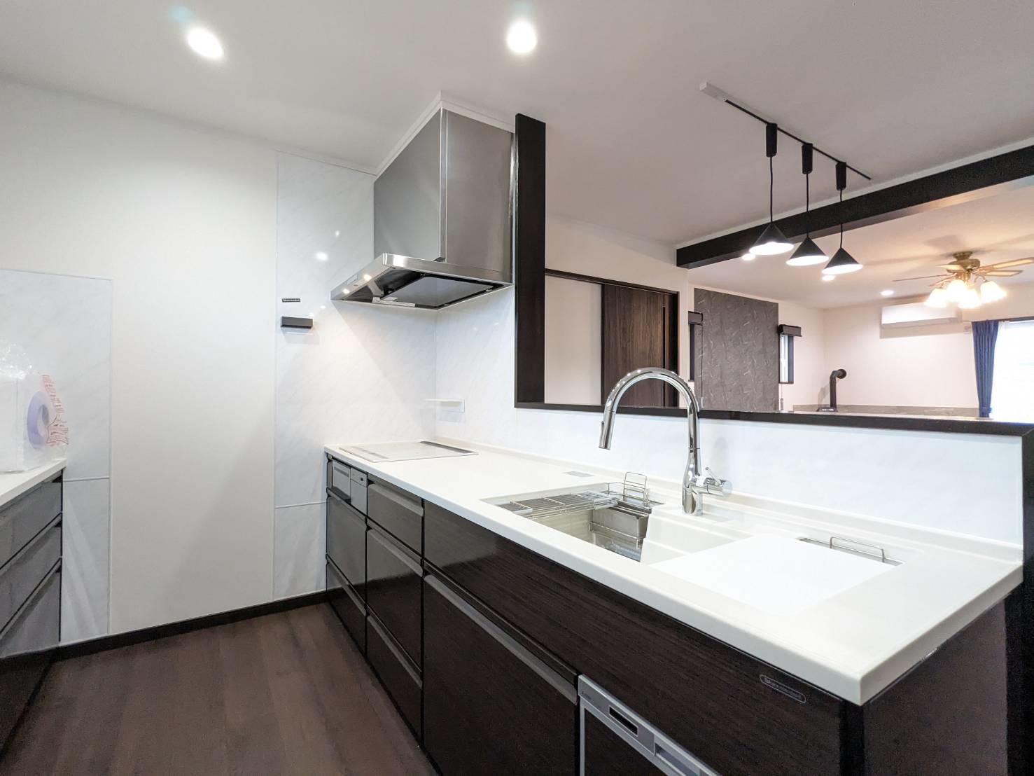 キッチンにはタカラスタンダードのホーローシステムキッチン「GRANDIAグランディア」を採用しました! ホーロー素材の最大の魅力は汚れに強く、お手入れが簡単に行える点です。キッチンは油汚れや調味料の飛び散りなど、住宅の中でも汚れる場所の一つです。タカラのホーローは内部が鉄でできており、表面はガラス質を吹き付けて成型されているので、鉄とガラスの丈夫さを兼ね備え、中まで汚れが浸透しないという特徴があります。油汚れはもちろん、調味料の液だれによる輪染みなどもさっと水拭きするだけでキレイに落とすことができます。今回採用したキッチンは扉もキャビネットの中も全てがお掃除しやすいホーロー素材でできているので、ずっとキレイなキッチンが続きます! 従来のキッチンは独立していましたが、対面式キッチンに変更し、リビング全体を見渡せるようになりました。