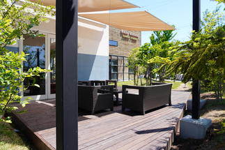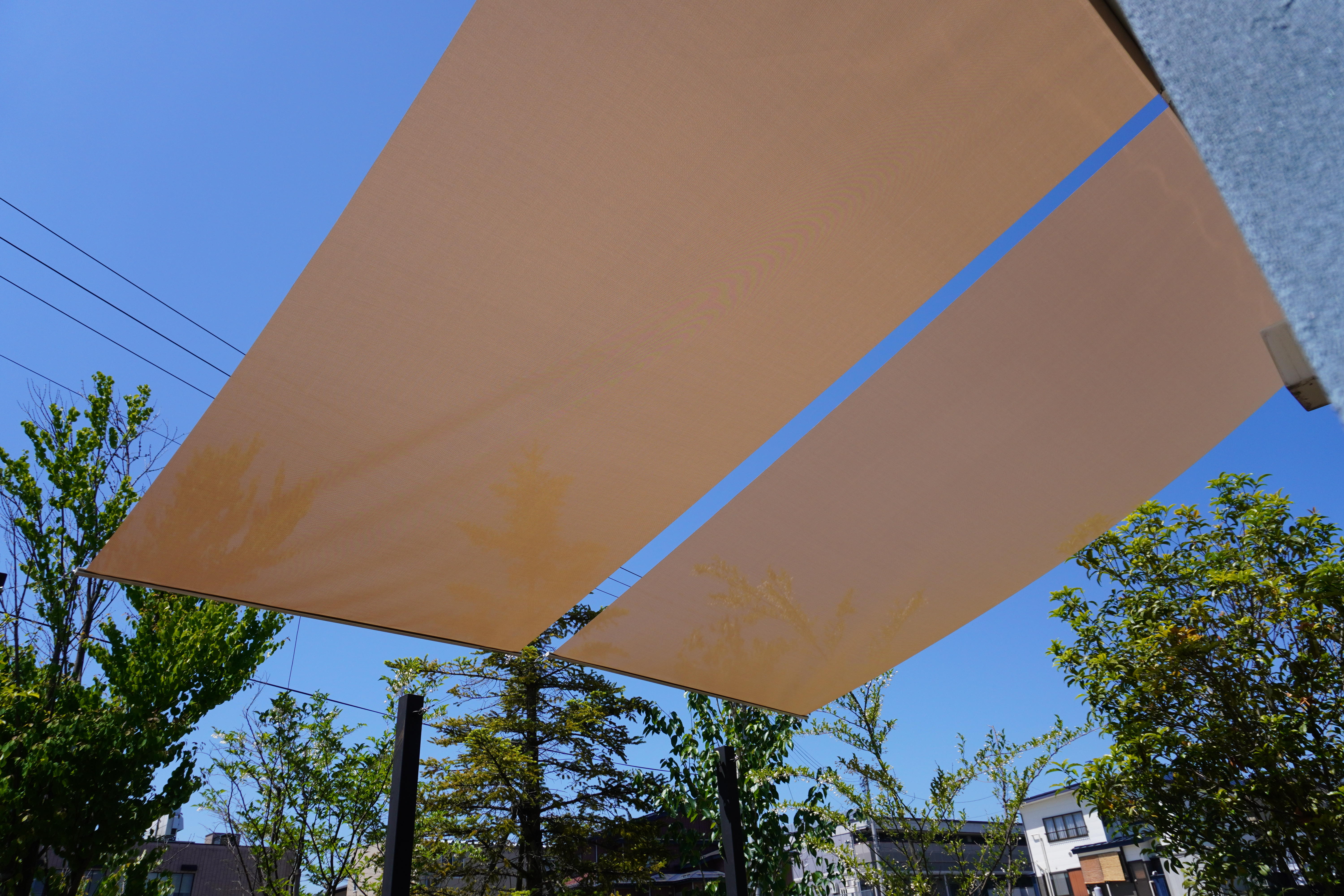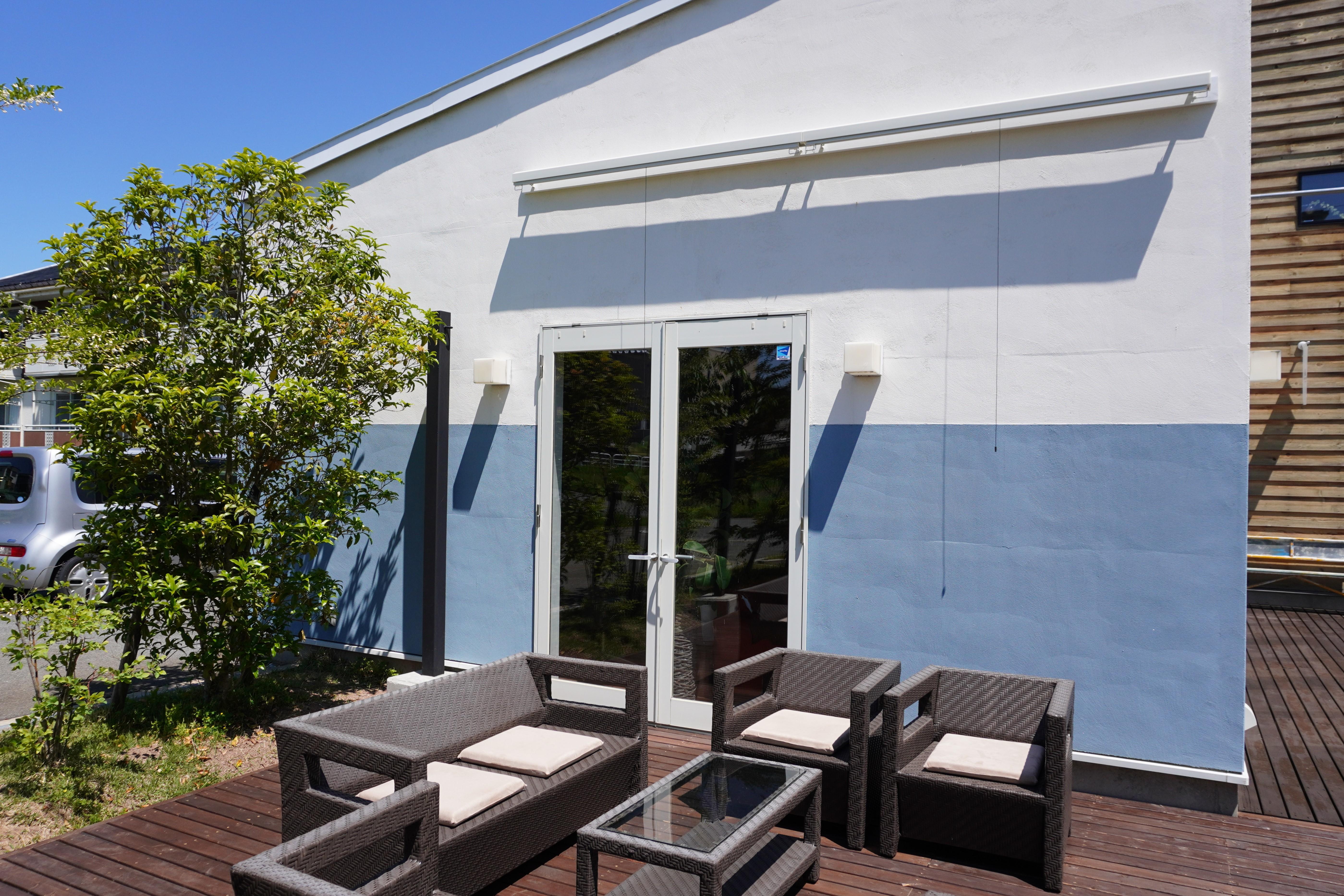 また、外壁部分にはLIXILの「スタイルシェード」を取り付け、陽射しを遮ることができる快適なテラス席を実現しました。スタイルシェードは生地を収納するためのボックスが一体となっており、簡単に出し入れができるため、使用しないときはしまっておくことができる便利な日除けです。