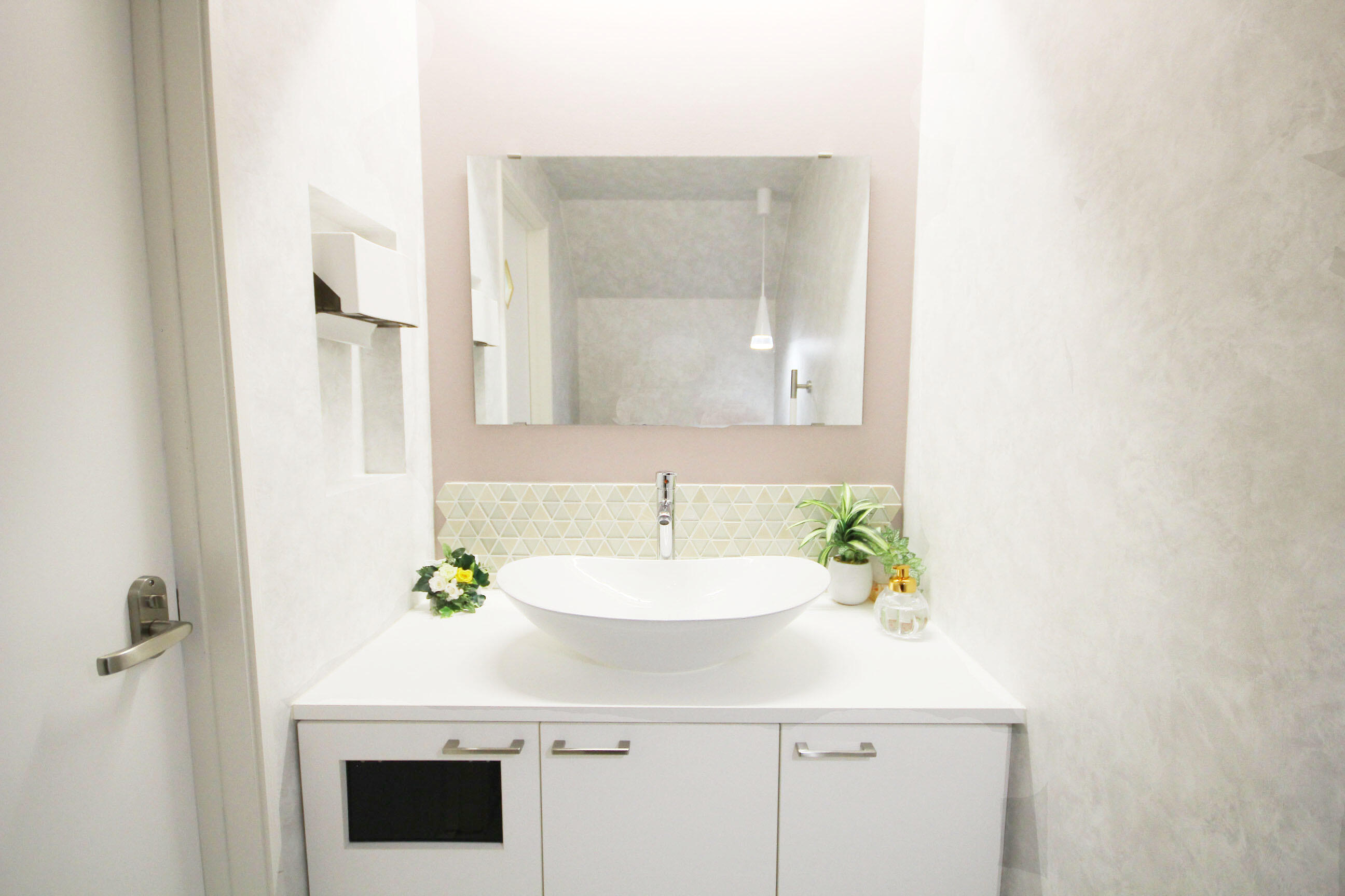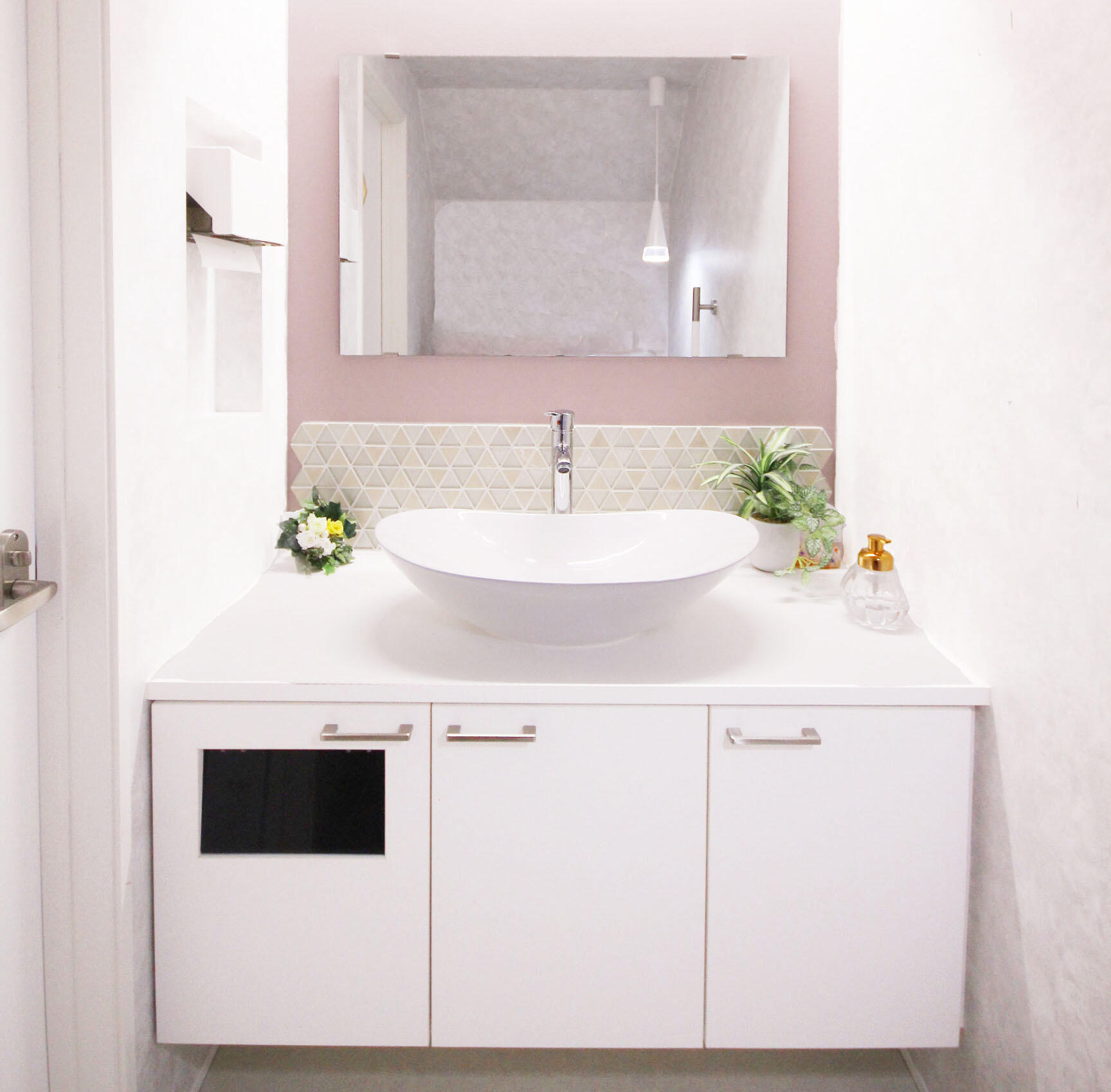 造作の洗面台は、白を基調とした清潔感のある棚と洗面ボウルに、ミドル部分へタイルをアクセントとして取り入れました。収納スペースもたっぷりと確保しており、ゴミ箱や掃除道具、トイレットペーパーなど、日常使いのアイテムをまとめて収納できます。丸ごと収納できるので、洗面まわりをいつでもスッキリと保つことができます。