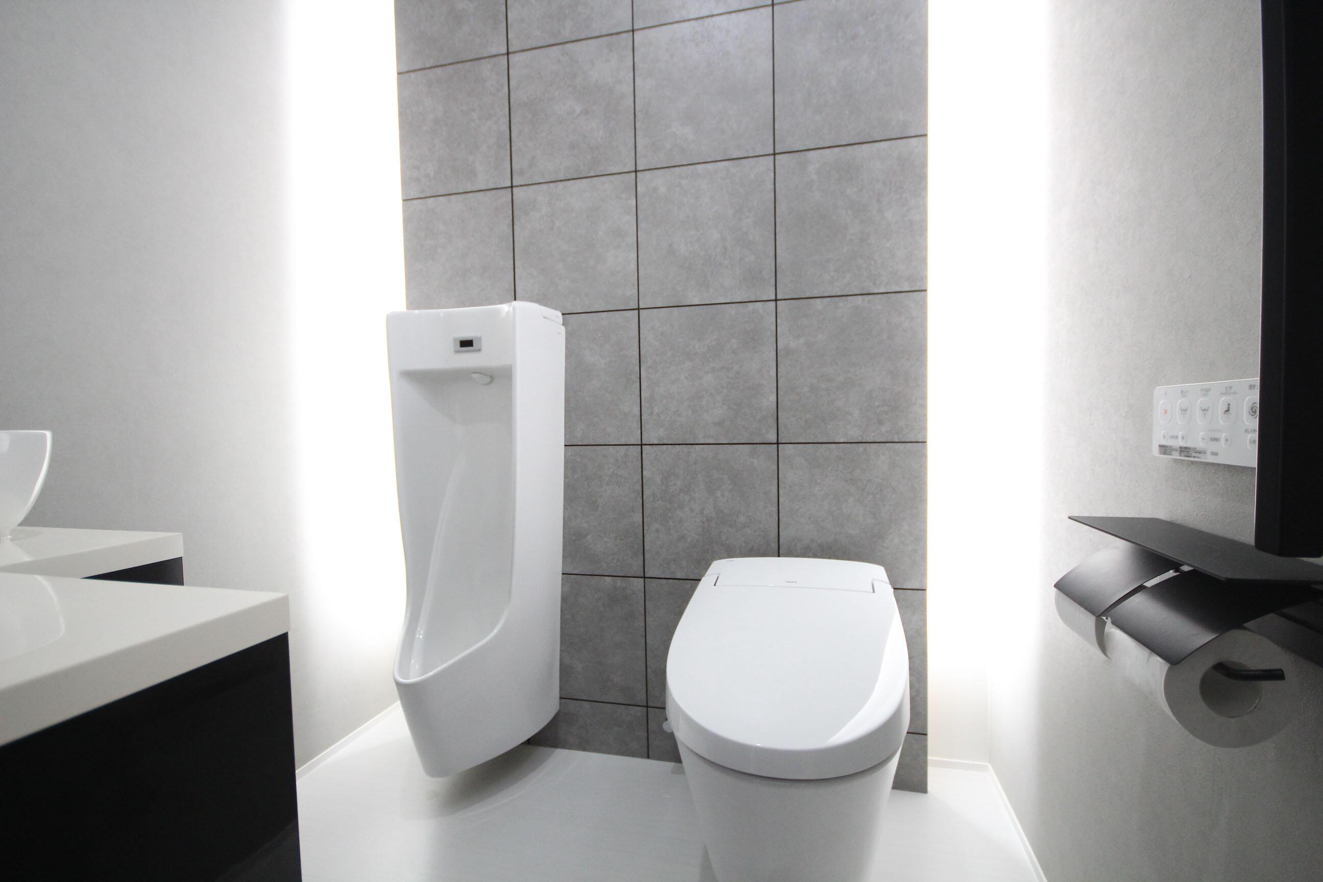 1F男子トイレは、背面の壁にグレーのモルタル調メラミン化粧板をカットして目透かし張りで施工し、両側に間接照明を設置。全体をモノトーンでまとめることで、まるでホテルのような高級感のある空間を実現しました。
