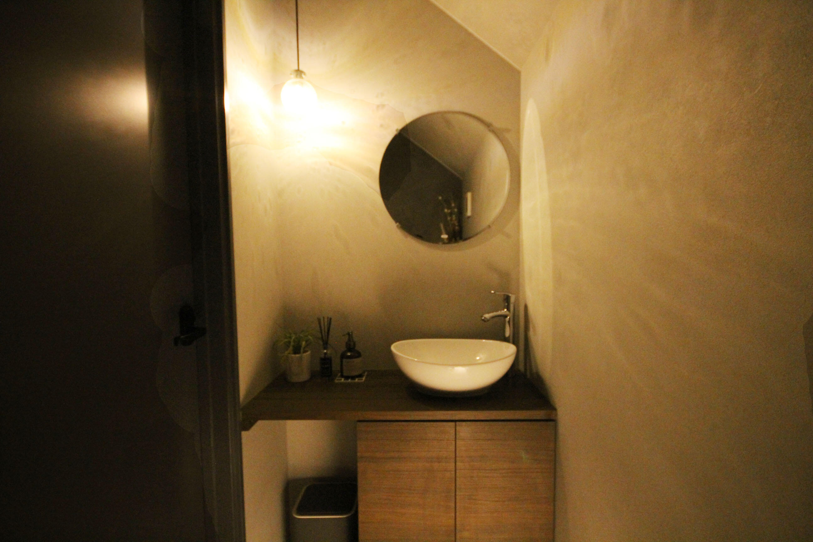 丸い鏡と洗面ボウルが印象的な、おしゃれな造作洗面台。ペンダントライトのやわらかな明かりが、洗面まわりにやさしく広がります。