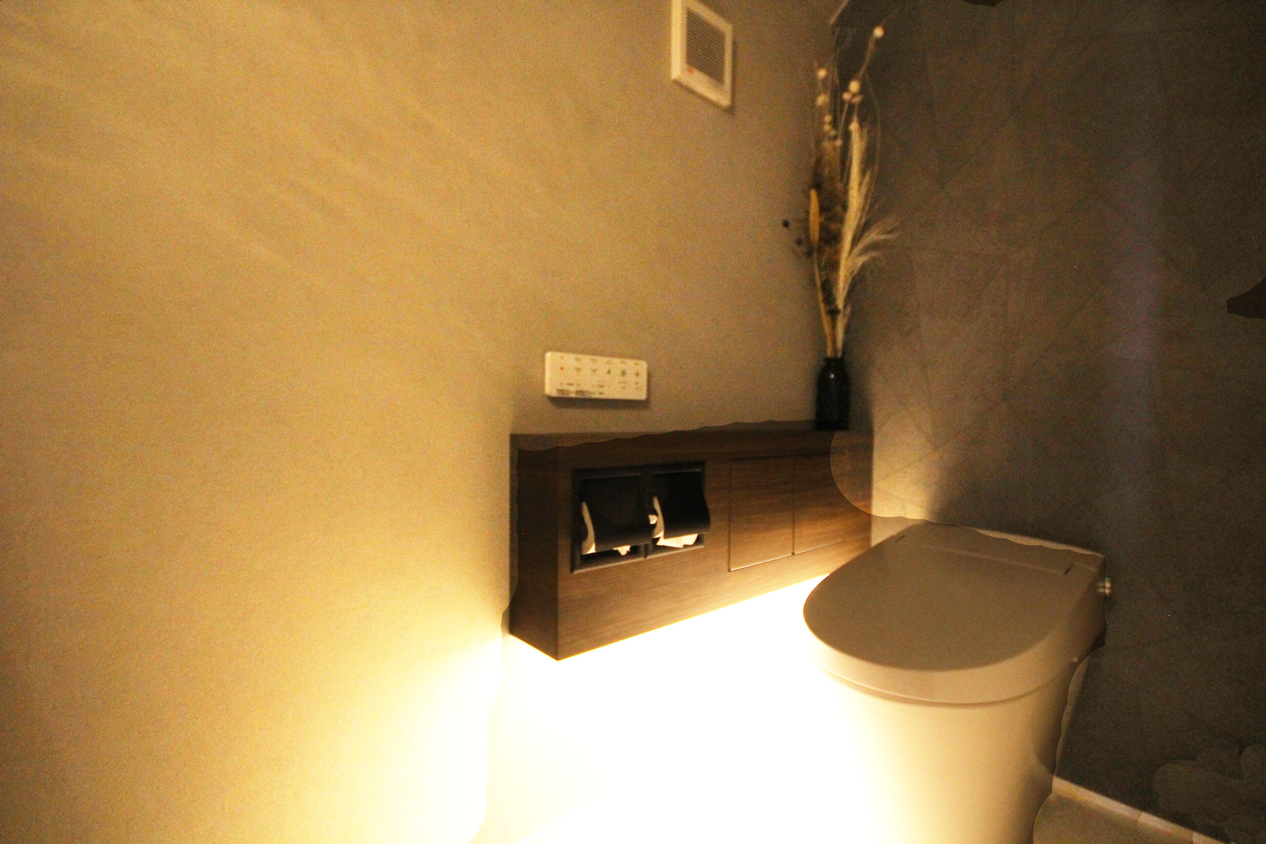 2階のトイレは、1階とは対照的にダークカラーを基調としたシックなデザインに。間接照明やペンダントライトの光を効果的に取り入れることで、壁に陰影が生まれ、高級感のある落ち着いた空間に仕上がりました。