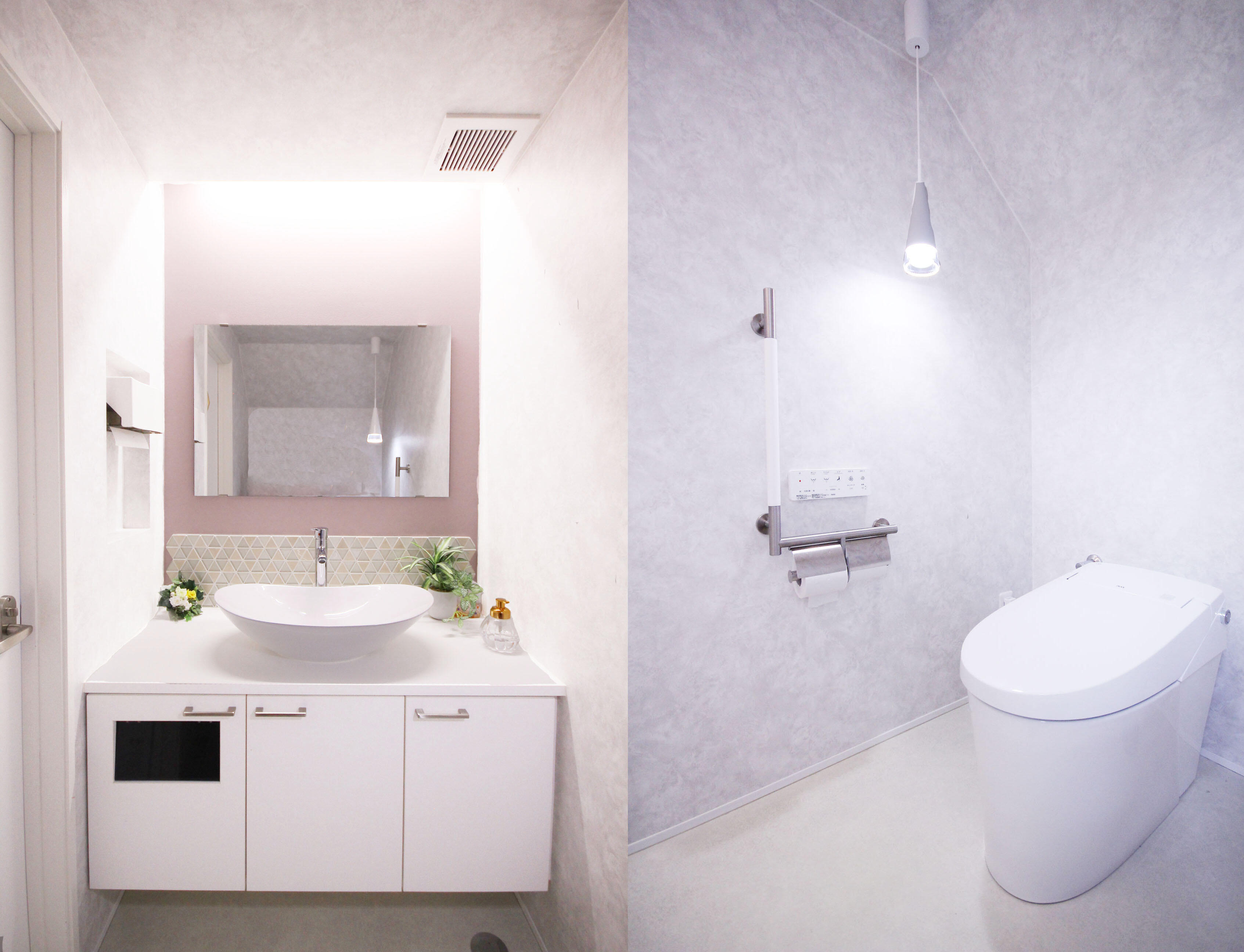 1F女子トイレは明るく開放感のある空間に仕上げました。階段下という制約のある空間ですが、広めに確保した手洗いスペースと大きな鏡で、圧迫感を感じさせない設計になっています。手洗いスペースの背面にはくすみピンクのアクセントクロスを取り入れ、明るさと上品さを兼ね備えたデザインに仕上げました。