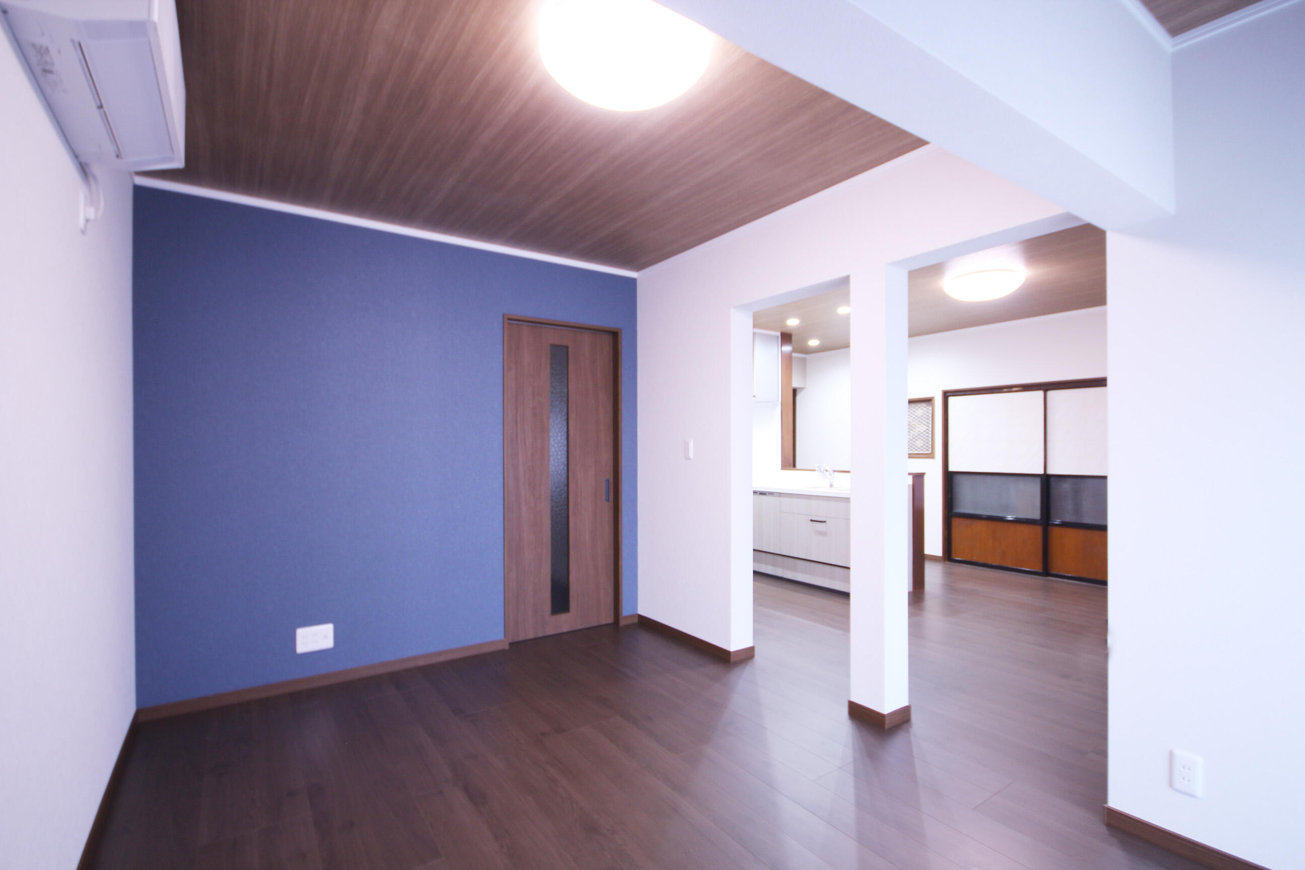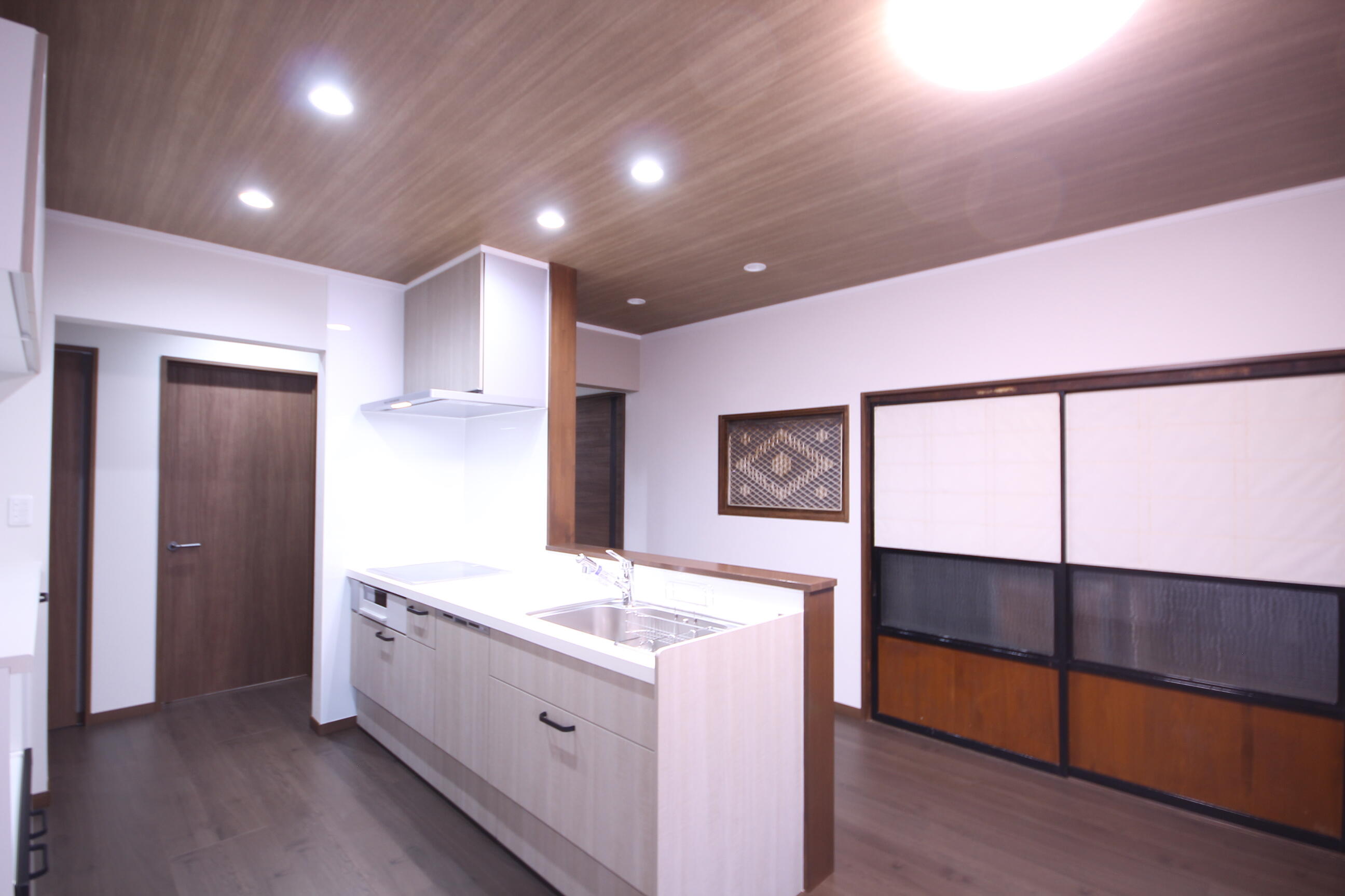 それぞれ分かれていた2つの部屋を、現代の暮らしに合わせて統合しました。特にこだわったのは、隣接する客間の「障子」との調和です。日本家屋の風情を壊さないよう、内装材や設備機器のカラーを厳選しました。間仕切りをなくしたことで開放感がありながら、懐かしさも感じらえる、心安らぐ時間が流れるリビングダイニングとなりました。