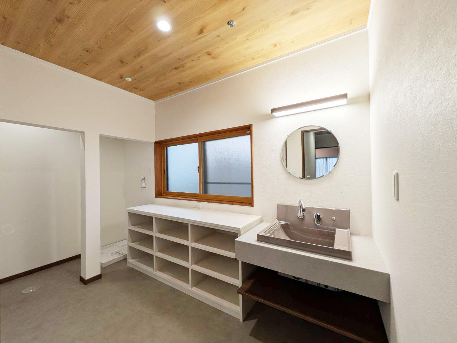 浴室の位置を変更し、新たに4.5帖のゆとりあるランドリースペースを確保しました。洗面台には、ボウルや収納棚を自由に組み合わせられるLIXILの『カスタムバニティ』を採用。 洗面ボウルには温かみのあるニュアンスカラーの「トープ」を、カウンターには上品な石目調の「モルティグレージュ」を選定し、空間全体を柔らかなトーンでコーディネートしました。 またスペース内には使い勝手に合わせて造作収納も設置。洗濯から室内干し、そして収納までをこの一室で完結できる、デザイン性と実用性が融合したランドリールームが完成しました。