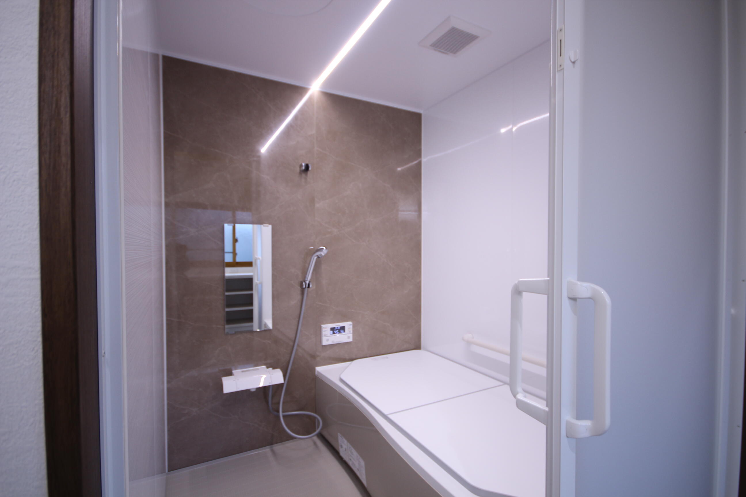 浴室には、パナソニックの『オフローラ』を採用。正面のアクセントパネルには、深みのある「フラゴナールブラウン」をセレクトしました。「和」を基調とした住まい全体のトーンと合わせ、浴室も温もりのあるカラーを取り入れることで、一日の疲れを優しく解きほぐす、高級感のあるバスルームが実現しました。