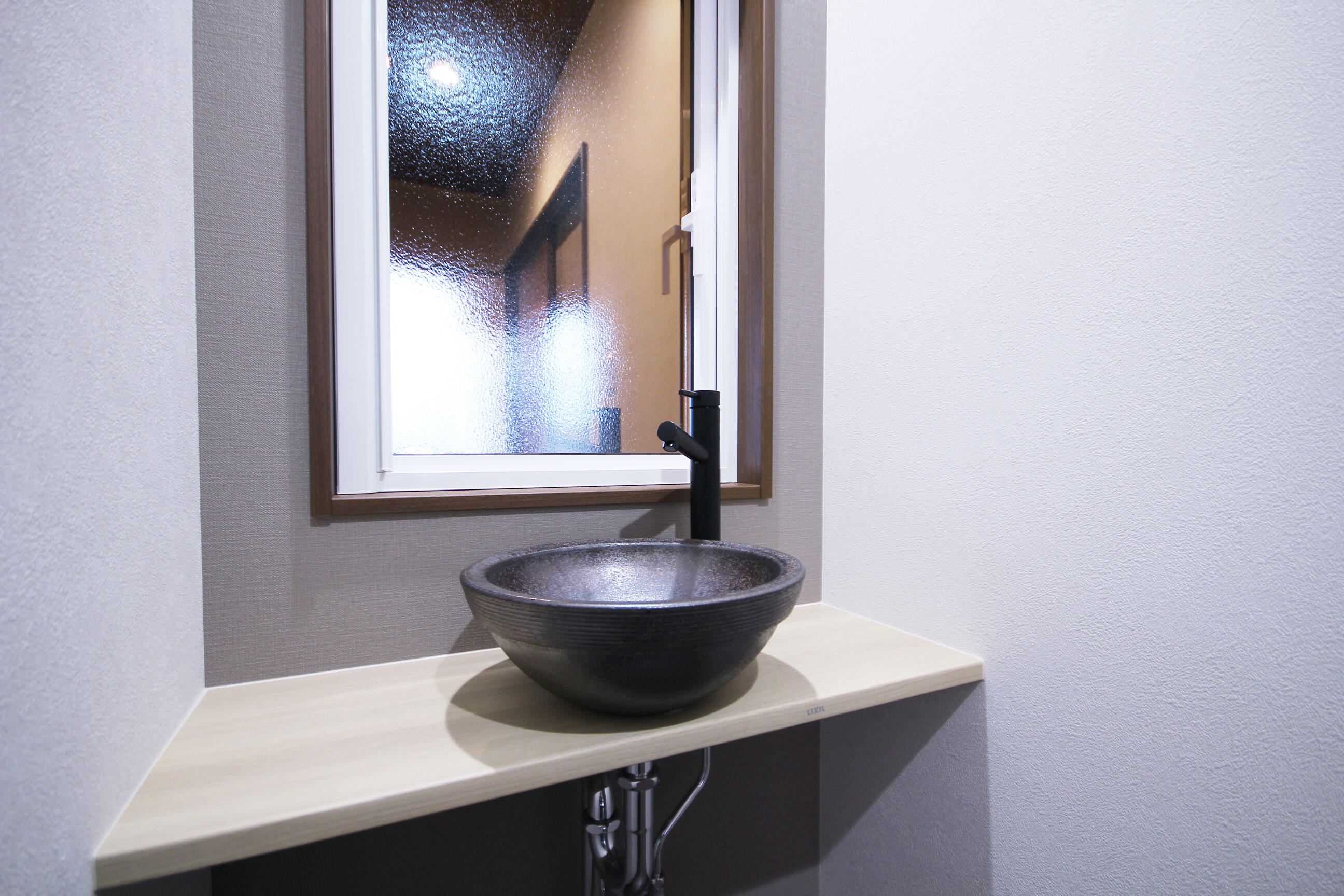 トイレの外に新しく設けた手洗いスペースには、ライフスタイルに合わせてアイテムを自由に組み合わせられるLIXILの『どこでも手洗い』を設置しました。手洗いボウルは、信楽焼ならではの素朴で暖かい質感で、水栓金具に「マットブラック」を合わせることで、モダンな印象に。奥行きがコンパクトなカウンター設計により、通路の広さを確保しながらも、意匠性の高いコーナーに仕上がっています。