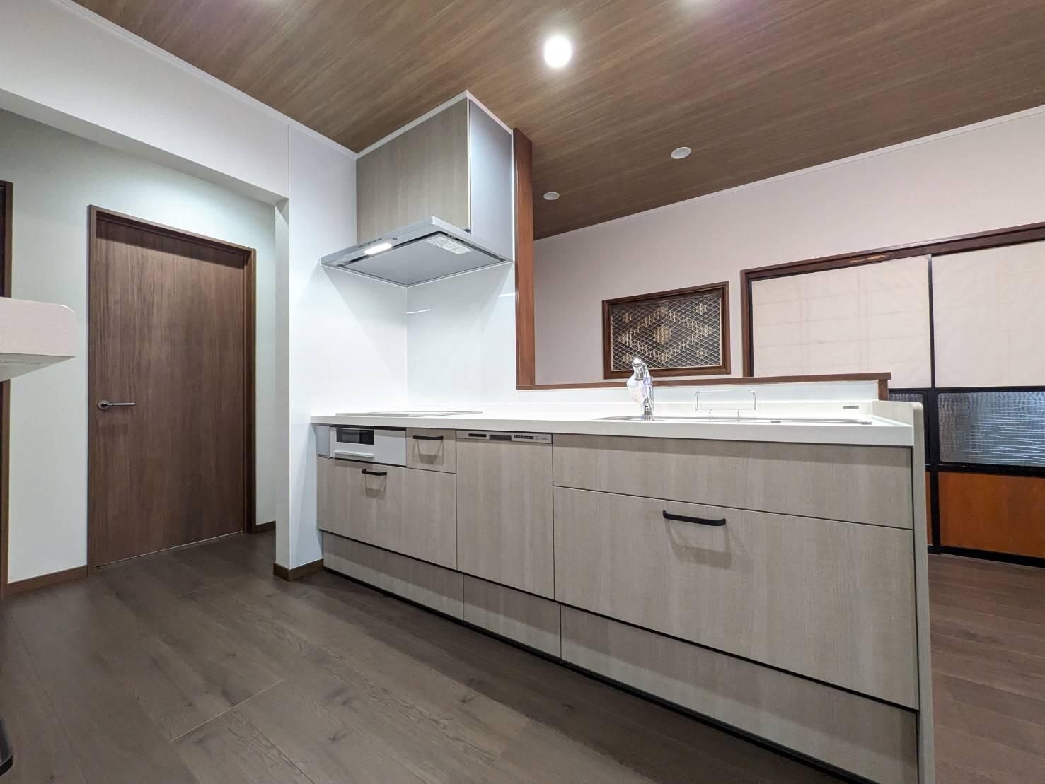 かつては北向きで閉鎖的だったキッチンは、LIXILの『ノクト』へと生まれ変わりました。扉カラーに選んだ「ラスティックアッシュ」は、茶色すぎない明るい色味の木目調で、既存の障子や建具が持つ和の趣とも相性抜群です。 機能面では、最新の設備を採用することで家事の効率が格段に向上。対面式への変更に加え、キッチンの横にダイニングテーブルを並べる「家事ラク動線」を実現したことで、配膳や片付けが驚くほどスムーズになる間取りが完成しました。