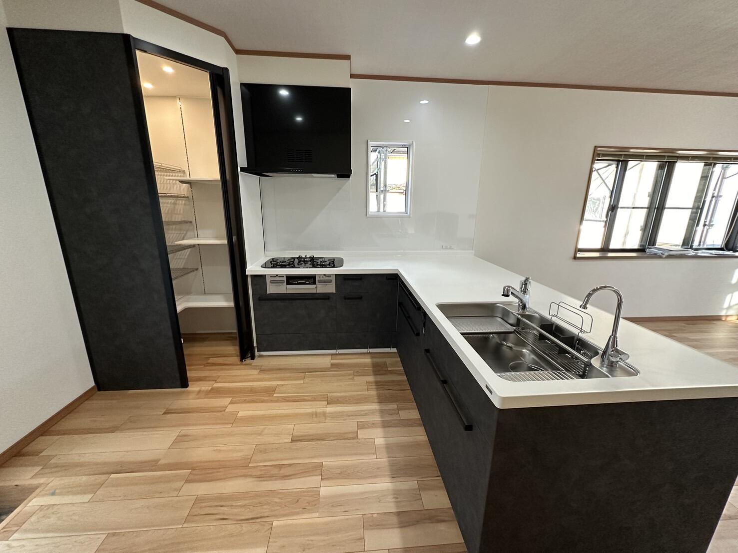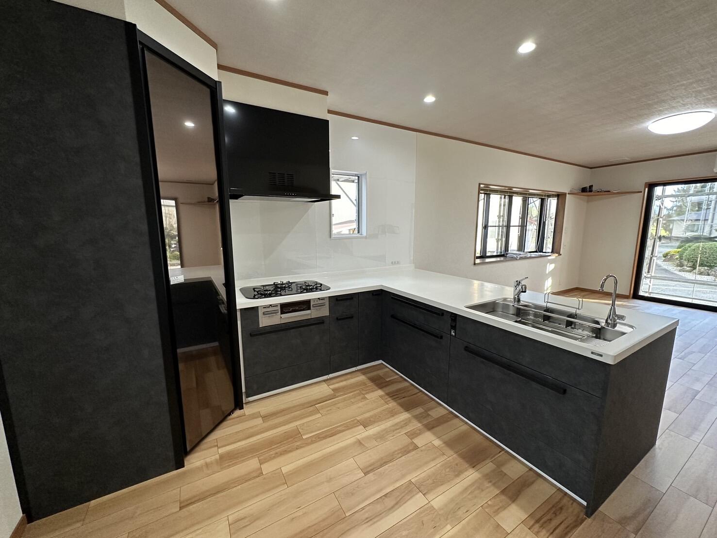 「収納力も、作業のしやすさも妥協したくない」というお施主様の想いから、LIXILのフラッグシップモデル『リシェルSI』を採用しました。 カラーは重厚感のある「ブラックスタッコ」を選び、取手もブラックで統一。しっとりとした質感の人造大理石ワークトップが高級感を演出します。対面式にしたことで、リビングにいるご家族と会話しながら料理ができる、開放的なキッチンになりました。