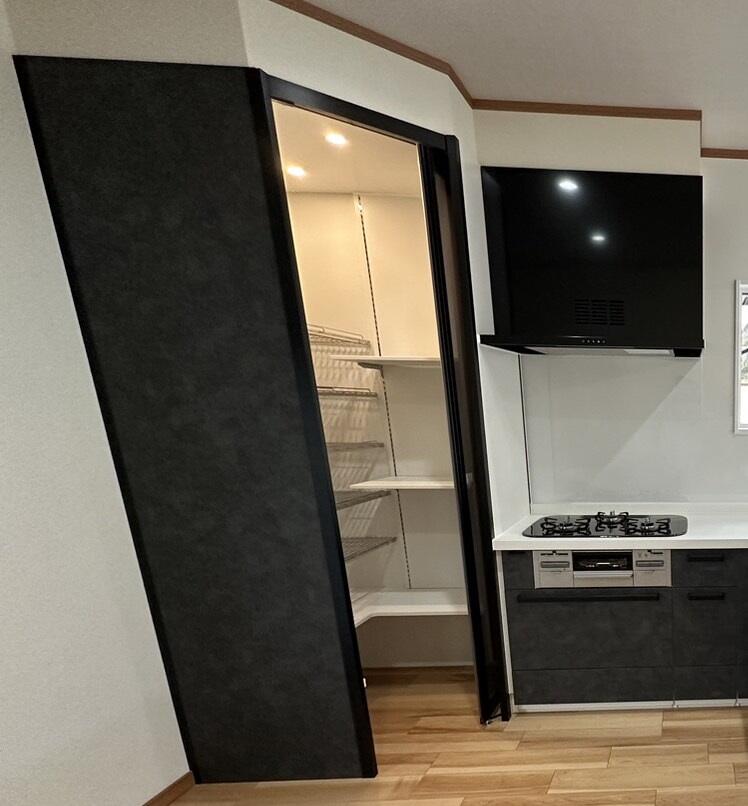 L型のキッチンはコーナー部分がデッドスペースになりがちですが、今回は「コーナークローゼット」を設置することで課題を解消しました。ウォークインタイプの収納で、食材はもちろん、季節限定の調理道具やストック品など、キッチン周りの様々なものをたっぷり収納できます。扉を開けると自動的にLEDダウンライトが点灯するため、奥に仕舞ったストック品もすぐに見つかります。下段は底板ないため、重い飲料やお米などもそのままスライドして収納可能です。