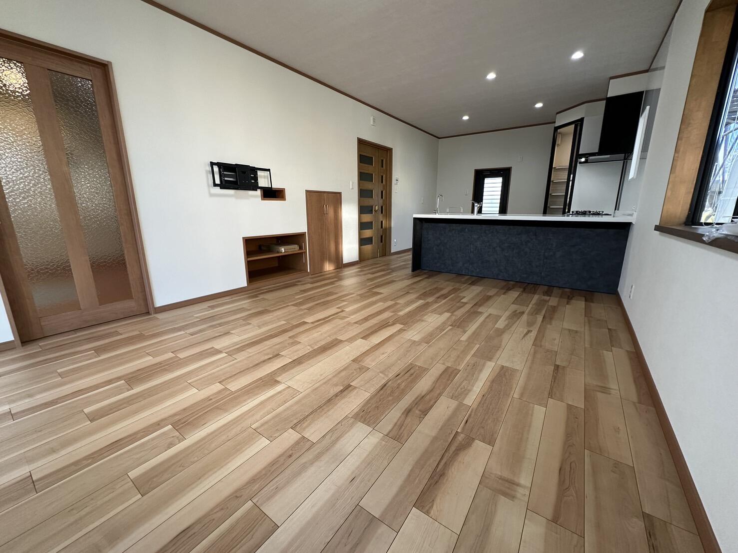 以前はダイニングと居室が分かれていましたが、間仕切りを撤去することで、17.7帖の一体型LDKが誕生しました。 内装デザインにもこだわり、キッチンの重厚感に合わせてクロスや床材をコーディネート。広がりがありながらも、落ち着きのあるシックな雰囲気に仕上がっています。