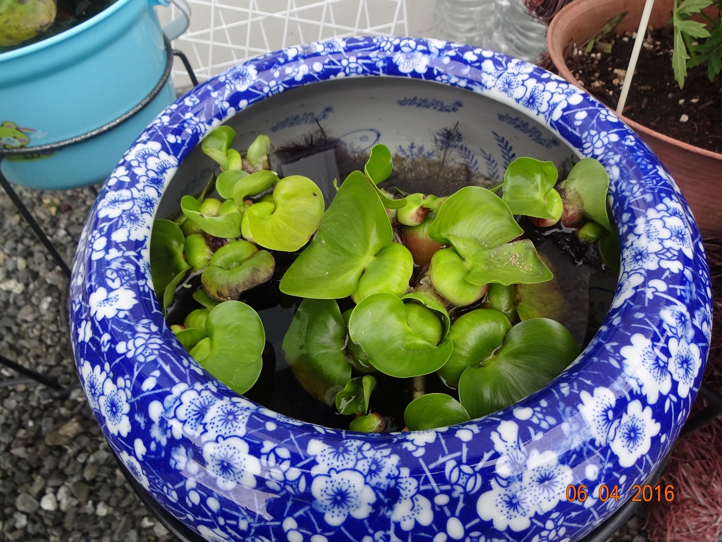 こちらも子世帯のお宅同様、スイレン鉢を水槽にリフォームしてプランター置きに載せられております。