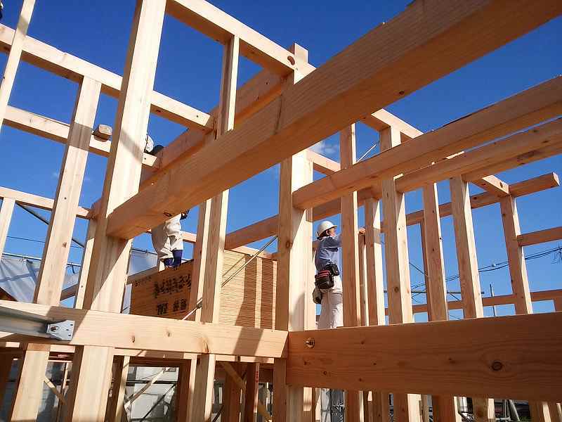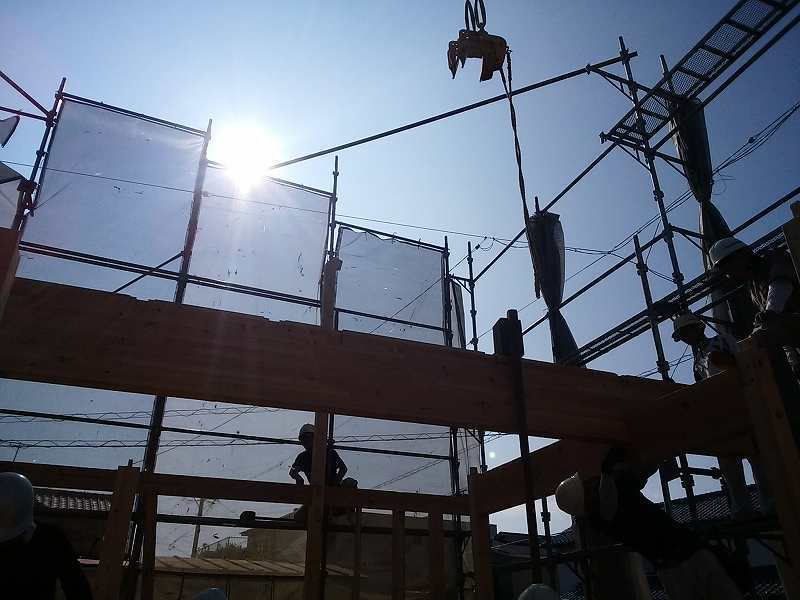 大工さんが10cm強の巾の梁を器用に歩き、柱にはめ込んでいく作業を見ているのは楽しいです。