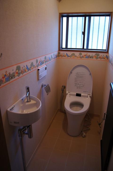 息子さんがお嫁さんとかわいいお孫さんを連れて、帰省される前に・・・。 ということでリフォームのご依頼をいただきました。息子様が男の子ということもあり、以前は小便器がついていたのですが、 そこは今回狭小手洗いに変更しました。そして、お孫さん用にと壁紙は、くまのプーさん仕様になりました(笑)。