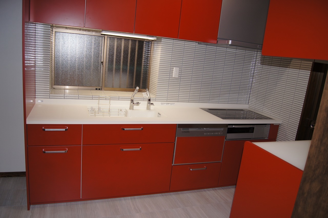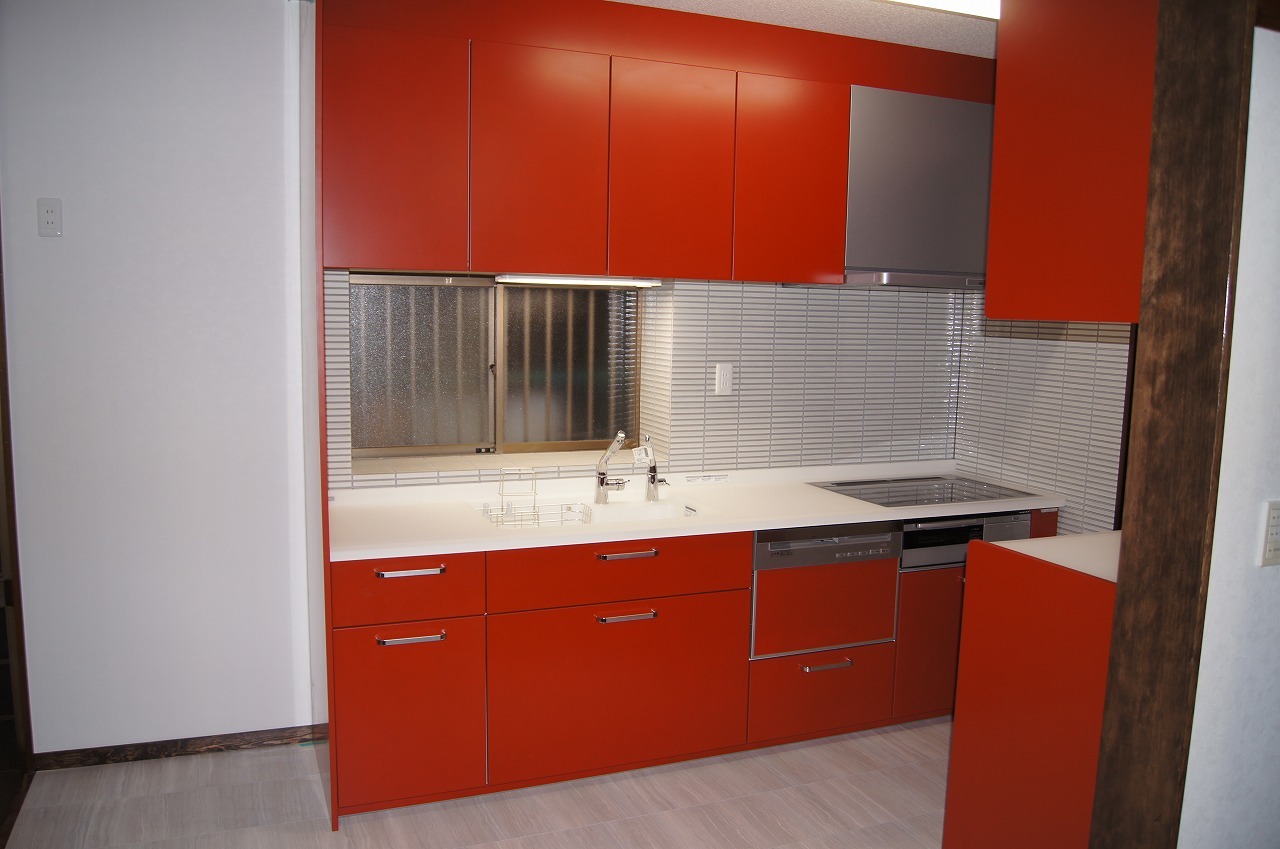 和調の赤い扉が、今回のリフォームの魅せどころです。フロアと壁タイルとの色合わせ苦労されていましたが、とてもよい雰囲気です!!短期間の集中工事お疲れさまでした。