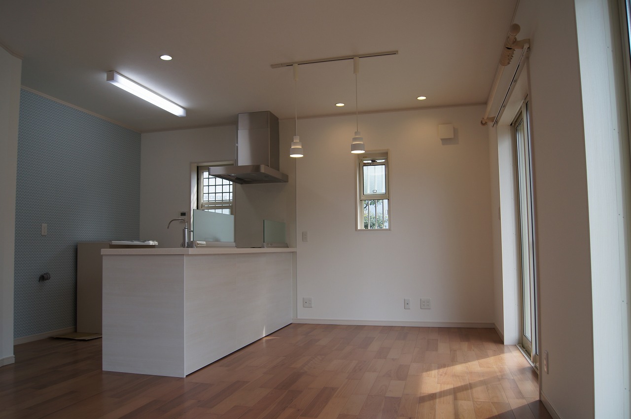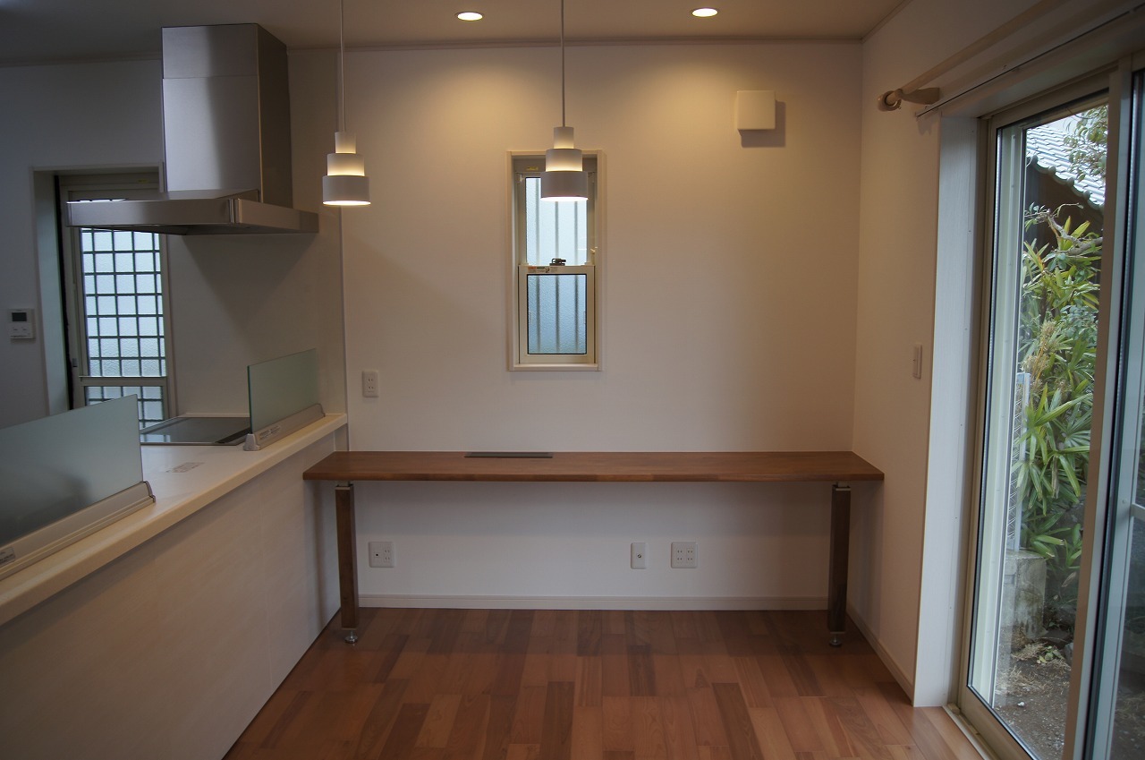 新築住宅のオプション工事です。 プランニングのときから計画していたのですが、出来上がりのイメージを確認してもらってからの工事となりました。 きっと、いまは小さな娘さんが、どんどん成長していき、このカウンターで勉強したりするのかなあ・・・ と想像しみんなでニンマリしながら、打ち合わせしていました。