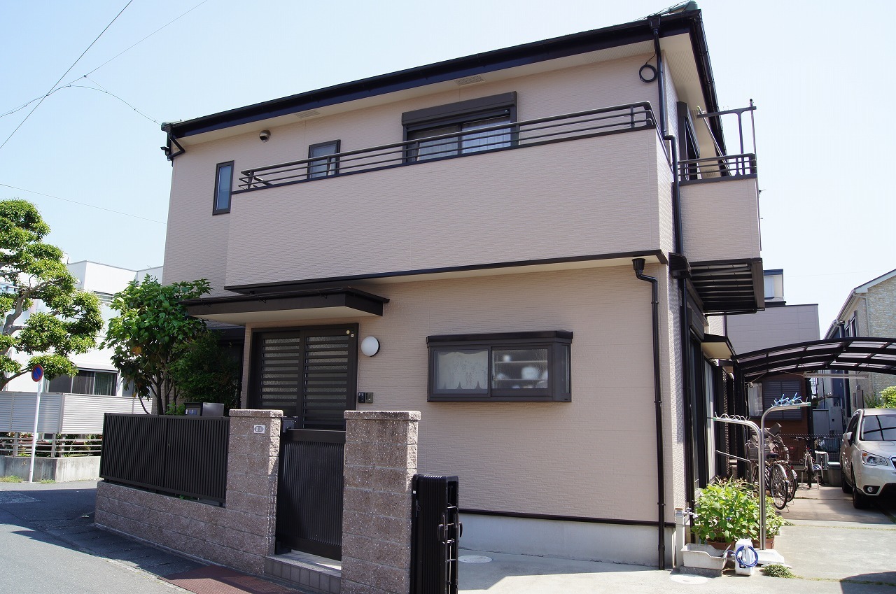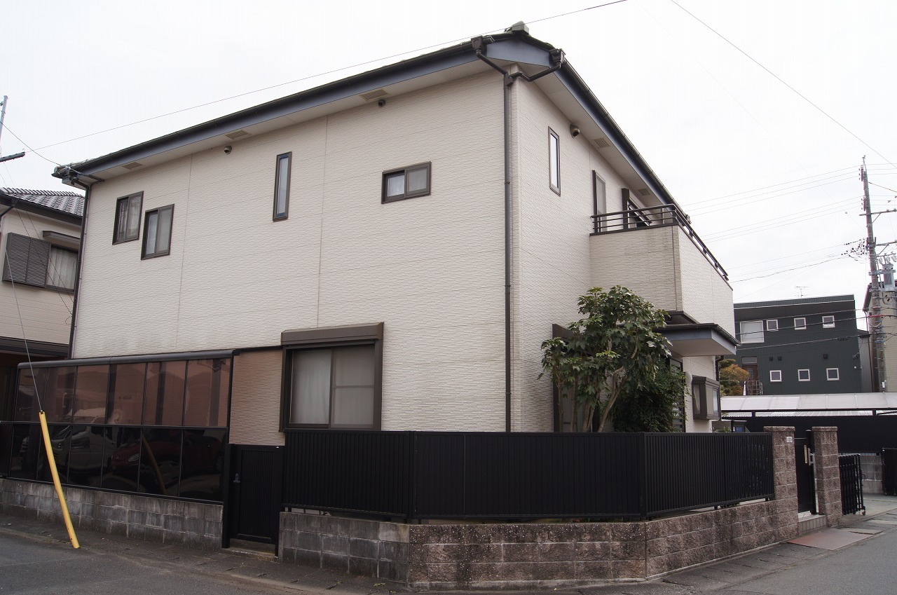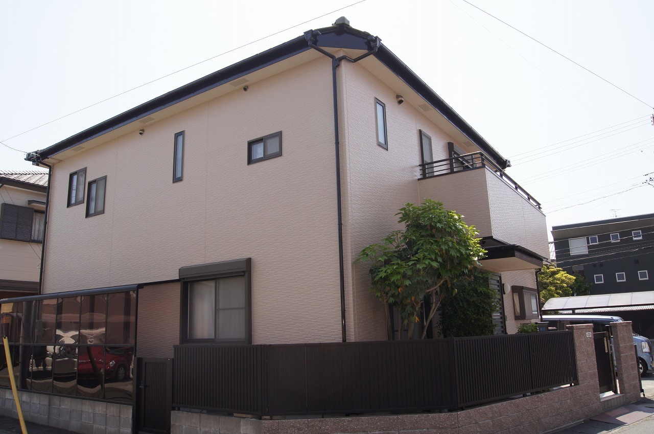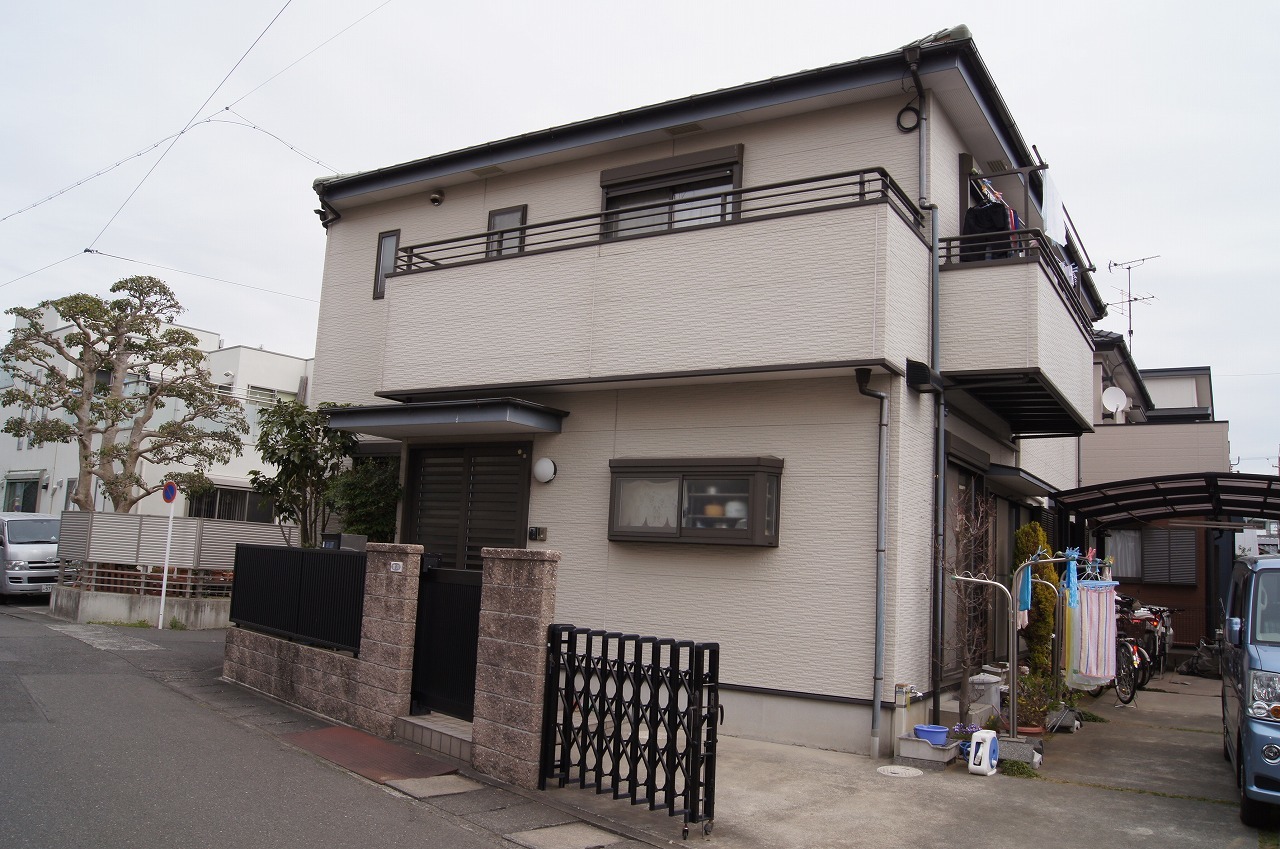 築8年を過ぎたあたりから、サイディングの継ぎ目コーキングの劣化や屋根廻りの木部やベランダ床の色褪せが気になりだしました。 気候のよい時期に工事をさせていただきました。 足場をかけたので、あわせて屋根の状態や、樋や窓廻りの状態をこまかくチェック。 塗装と一緒に、コーキングもやり直しました。