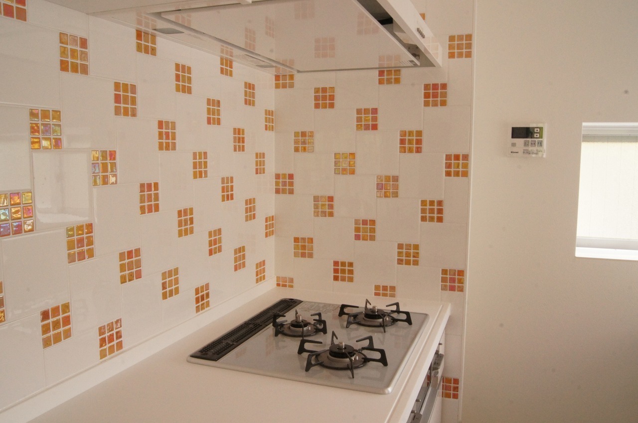 真っ白なタイルと少しオーロラがかったモザイクタイルを一枚一枚丁寧に職人さんが張りました。