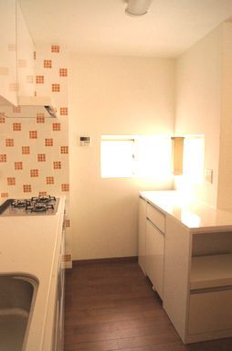 造作壁対面キッチンです。撮影者が立っている位置はホールです。