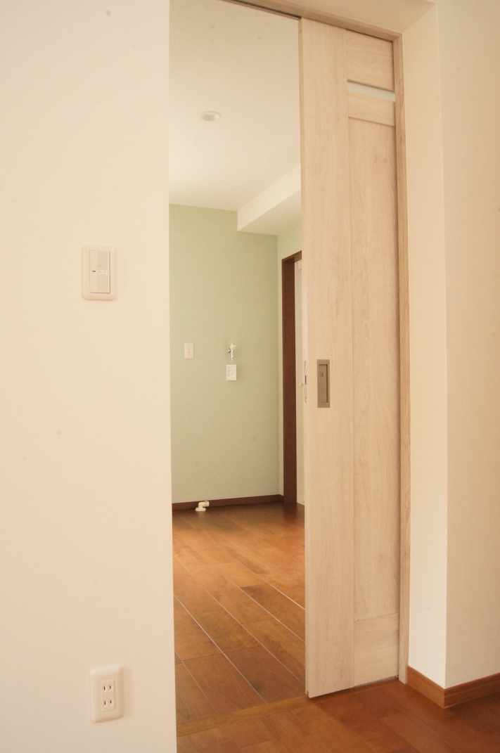 ホールから洗面化粧室への扉は、アウトセットの上吊り引戸です。