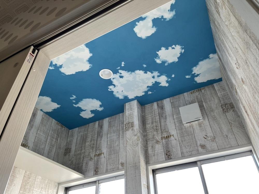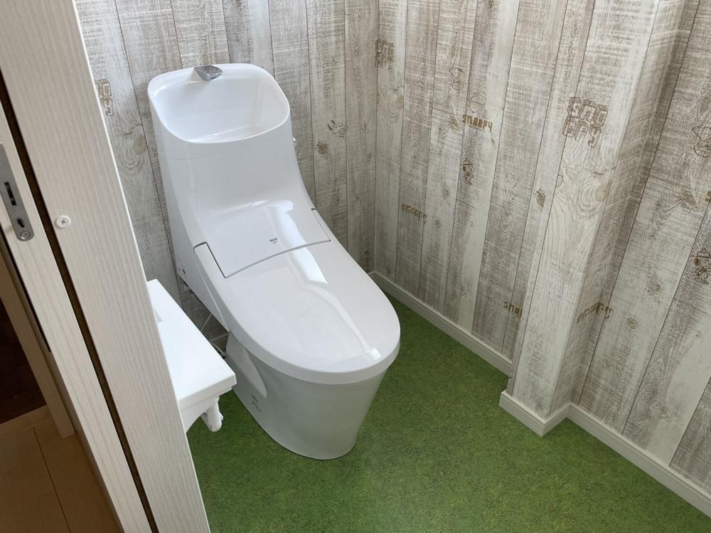 静岡市清水区、青い空・白い雲のAA級クロス、緑の芝生すてきなクッションフロアを採用いただいたすてきなトイレ空間に仕上がりました!お客様のセンスに脱帽です!