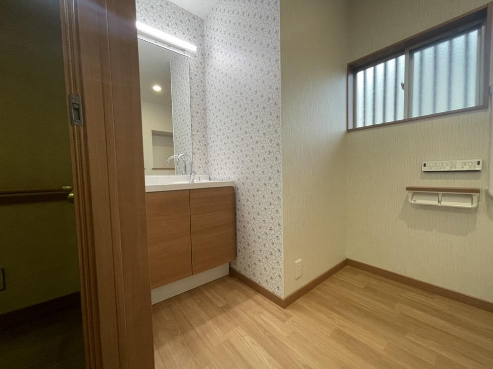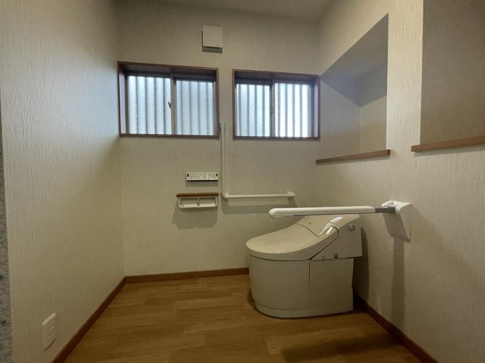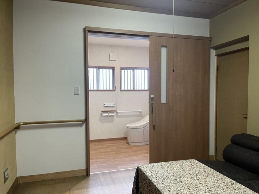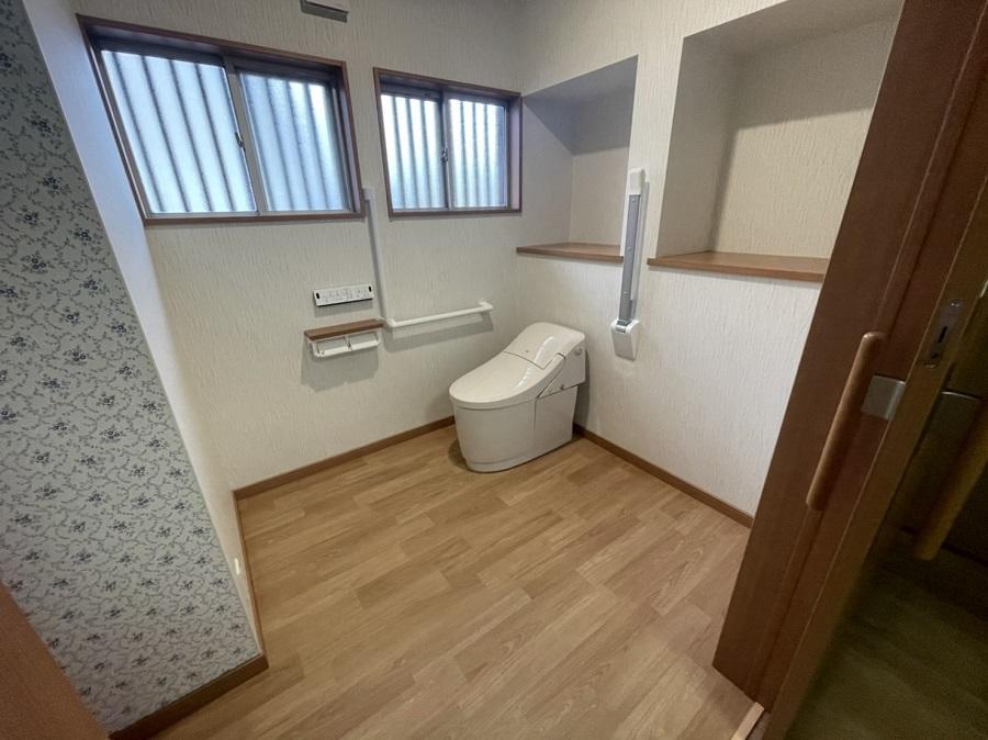 狭い入り口から個室に入っていくタイプのトイレを、高齢のお母さまが車いすで入れるようにリフォームしました。扉の位置を変えたことで、大開口の片引き戸を新設しました。介助スペース用に広々した個室にしました。手洗いもトイレ内で済ませることができるようにしました。便器のわきには、跳ね上げ手すりを採用いただき、介助が必要なタイミングでは、跳ね上げて邪魔になりません。お掃除のしやすいトイレを採用いただき、清潔感のある内装を心掛けました。以前と比べ、とても広々したので、とても満足頂きました。