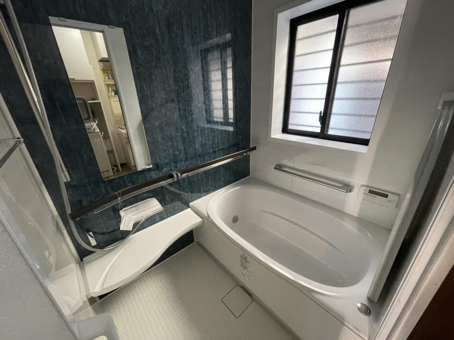 システムバス⇒システムバスの交換リフォームです。寒さが気になるシステムバスだったので、浴室丸ごと保温の「あたたかパック」浴槽のお湯が冷めにくい「サーモバスS」を気に入って採用いただきました。バスルームサイズを1216⇒1316サイズにしたので、浴槽が広々しました。洗い場側は、「スマートエスコートバー」を取り付けました。実用性がありながらスマートな仕上がりです。レザー調ブラウンを採用いただいたのでアクセントパネルとのカラーコディネートも素敵です!