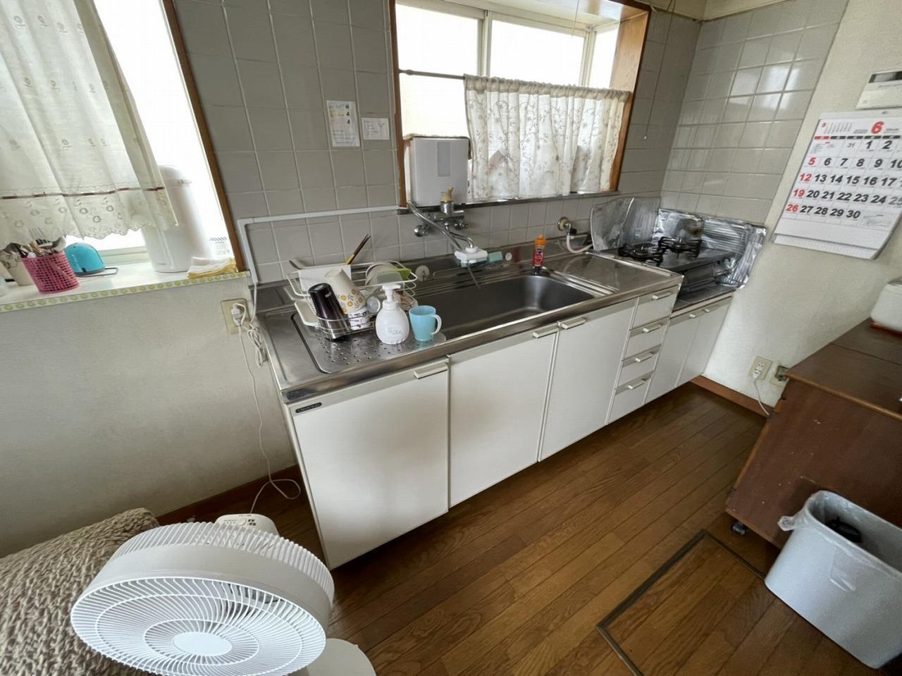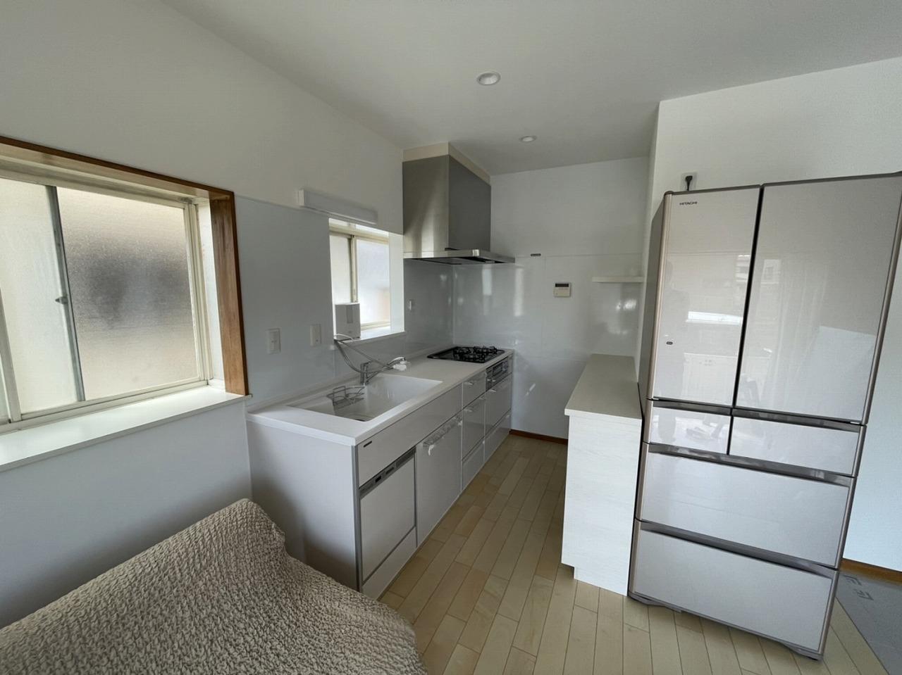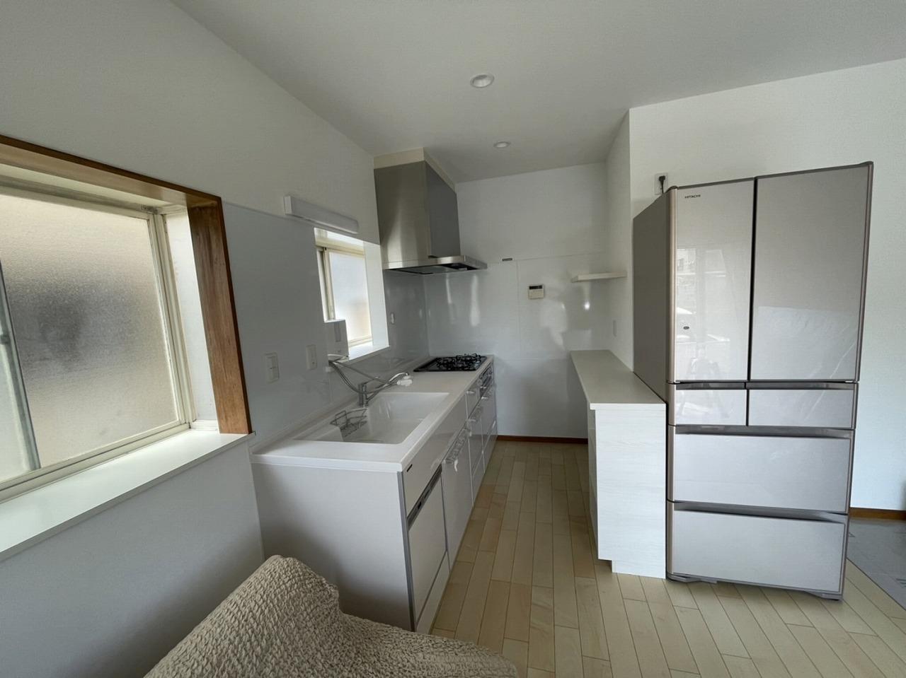 幅90センチのレンジフードを選択されて、窓にかかってしまうフードに対してふかし壁をつくりました。床を貼替えキッチンを交換してから壁天井を仕上げたので工期が9日かかりましたが、きれいに仕上がりました。