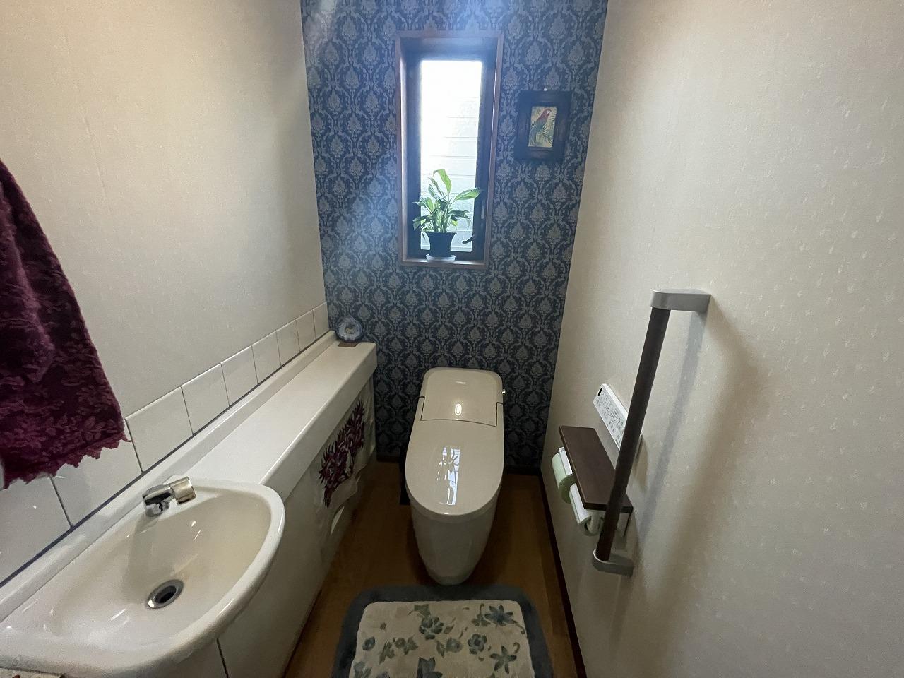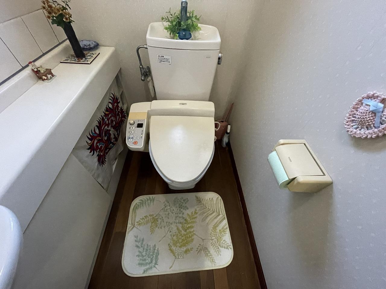 節水型トイレへの交換と同時に、背面の壁クロスと床フロアタイルを張替えしました。手すりや棚付き紙巻きも同時交換しました。