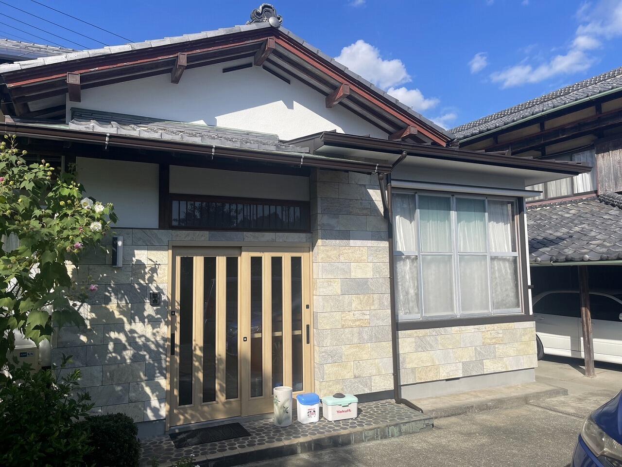 屋根廻りのリフォームと併せて、タイル外壁と玄関引き戸リフォームを行いました。大谷石の外壁材が剝がれていたので、タイル外壁へ張り替えしましたので、玄関は新築用の「JS」シリーズから選んでいただきました。今までと同じような雰囲気を意識しながらも、タイルの風合いや玄関引き戸デザインで洗練されたものになりました!