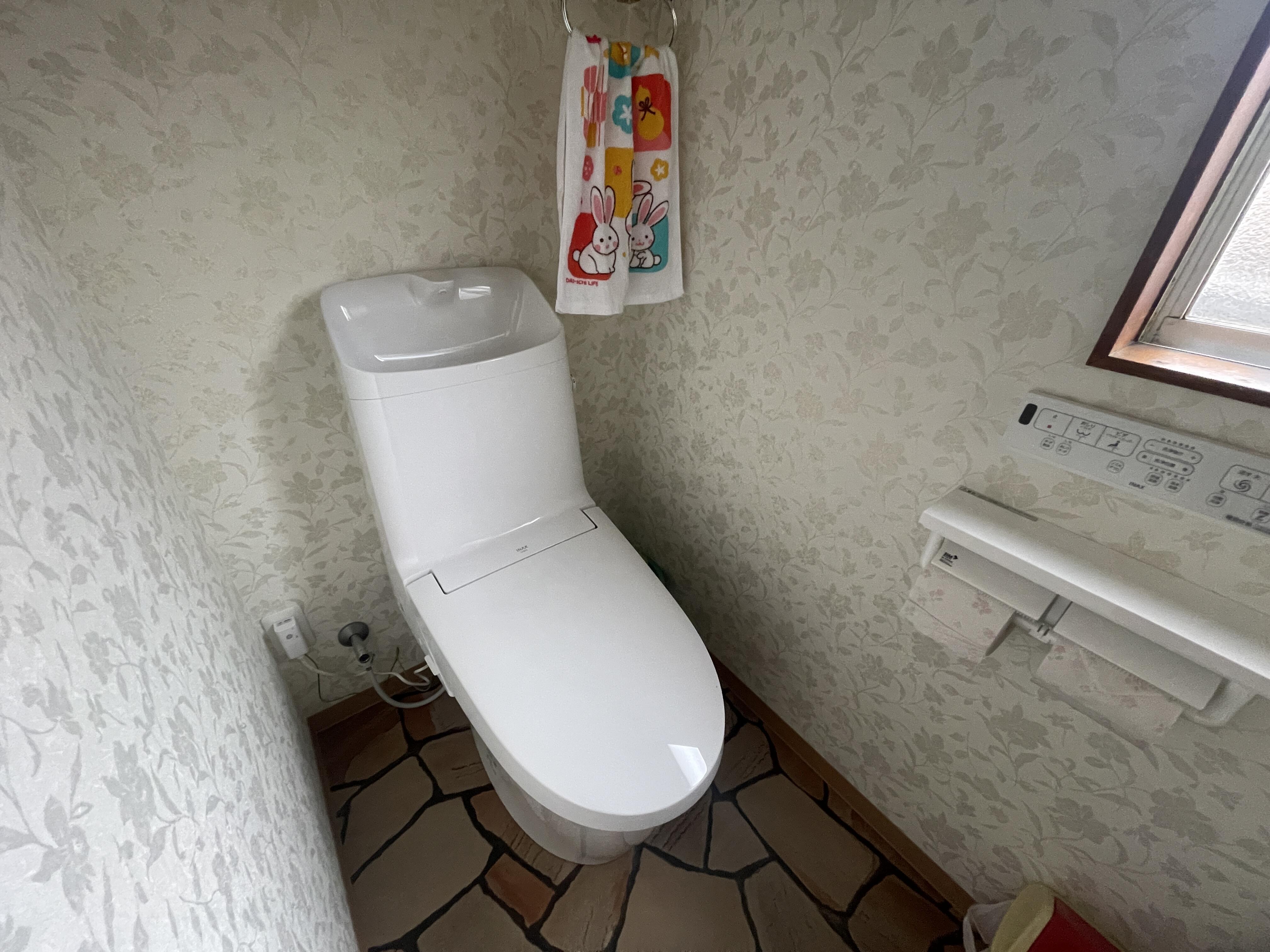 数十年使用していたトイレから水漏れ、玄関を感じトイレを部屋ごとリフォーム。床が沈んだり、壁が経年変化で黄ばんでいたりだったので、下地からつくり直しました。便器便座交換、内装(天井壁床)張替え、頭上に収納用の棚板追加しました。