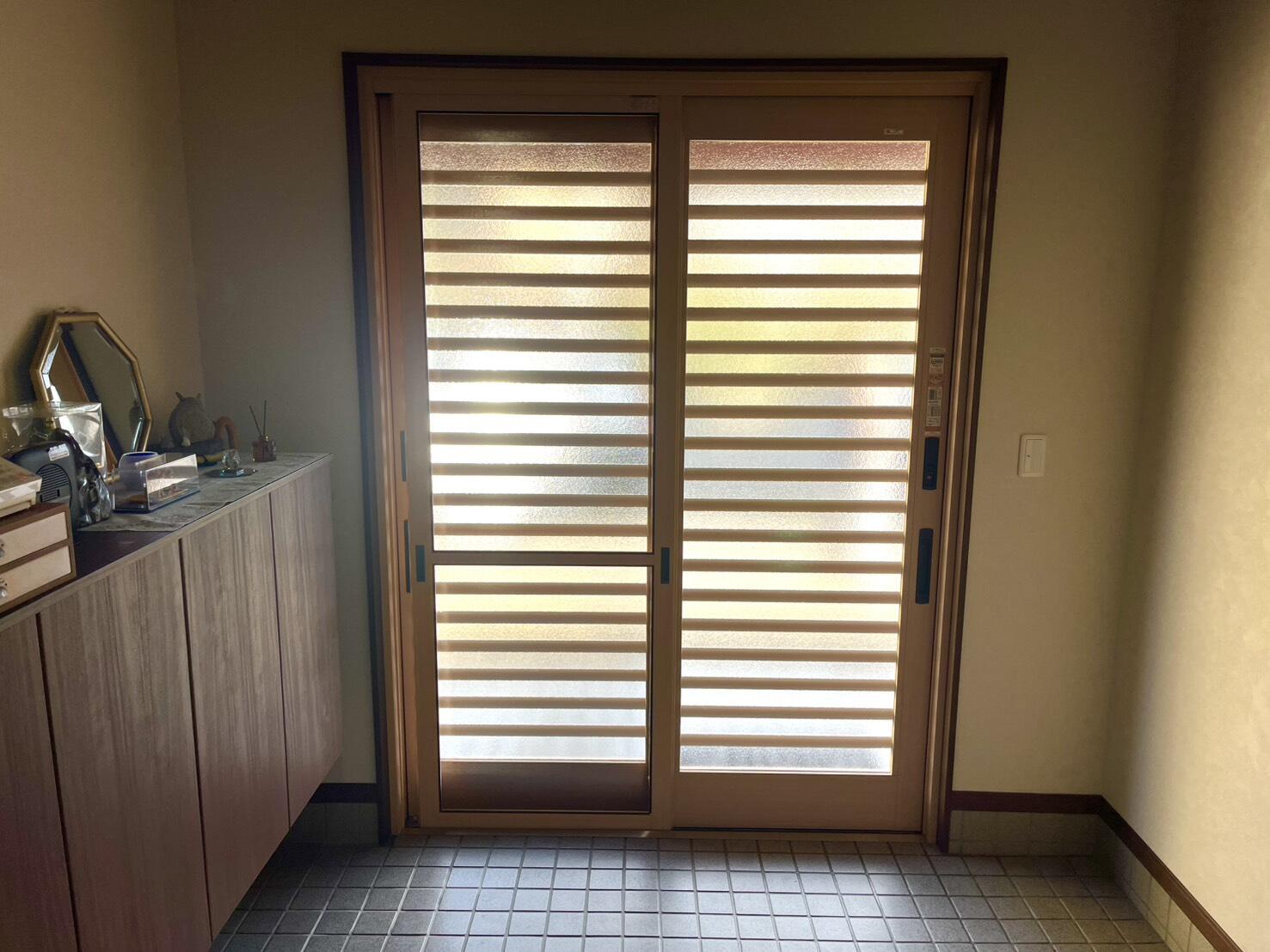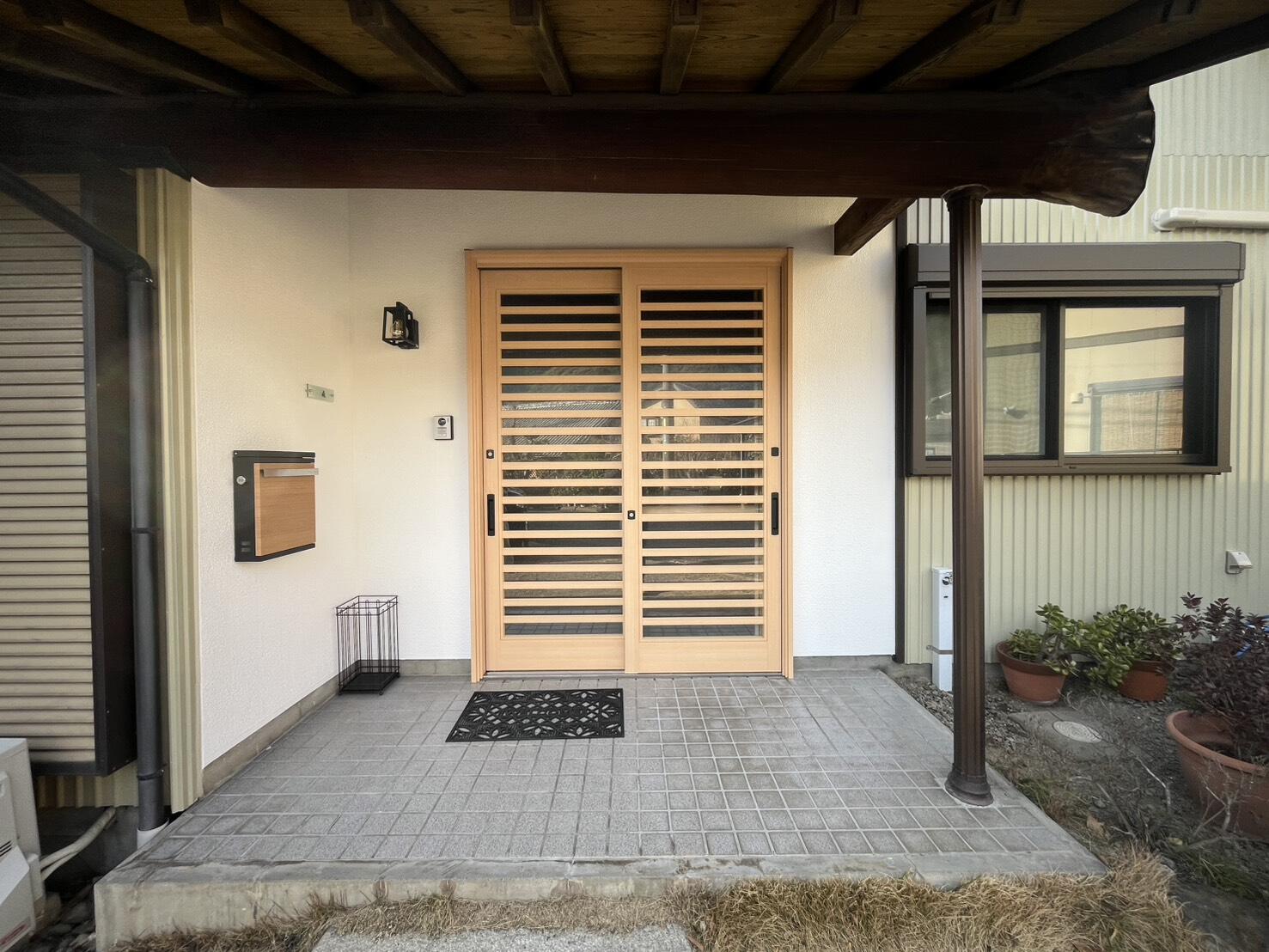 玄関引戸交換「リシェント」 槙調の色合い、縦桟→横桟へのデザイン変更、扉サイズ含め建物との相性が良いです。