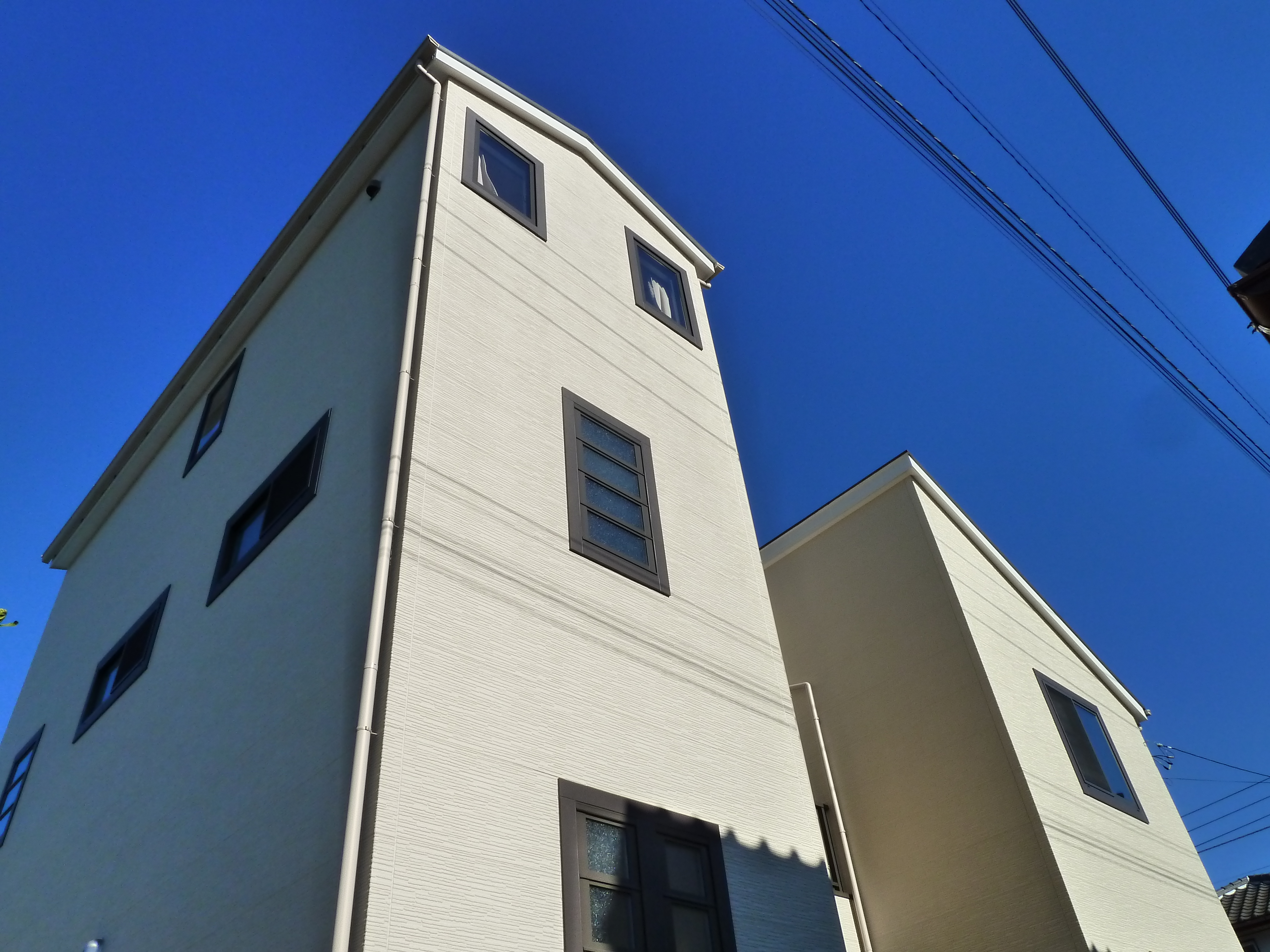 お子様の結婚を機に二世帯住宅を… 2家族の『団欒』と同時に『プライバシーの確保』 駐車スペースなどの問題をクリアするために、在来工法では難しい3階建てを2×4工法で建てました。 キッチンとお風呂は共有して『家族の対話』を。でも、それぞれのリビングで『プライバシー』 を。 お父様の趣味の部屋、10帖以上ある共有のウォークインクローゼット、若い夫婦の寝室は3階へ、3階バルコニーからは…北に富士山 南は駿河湾を一望できます。