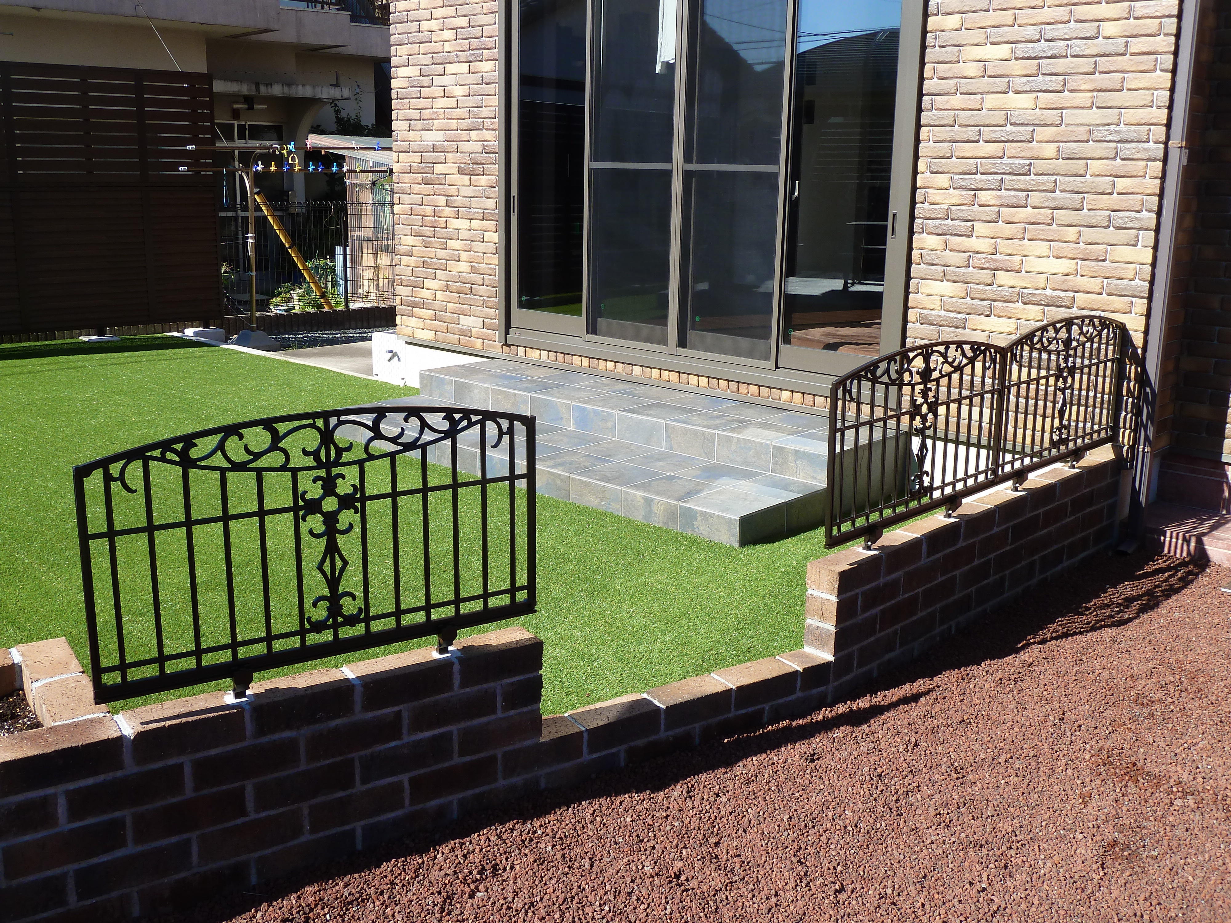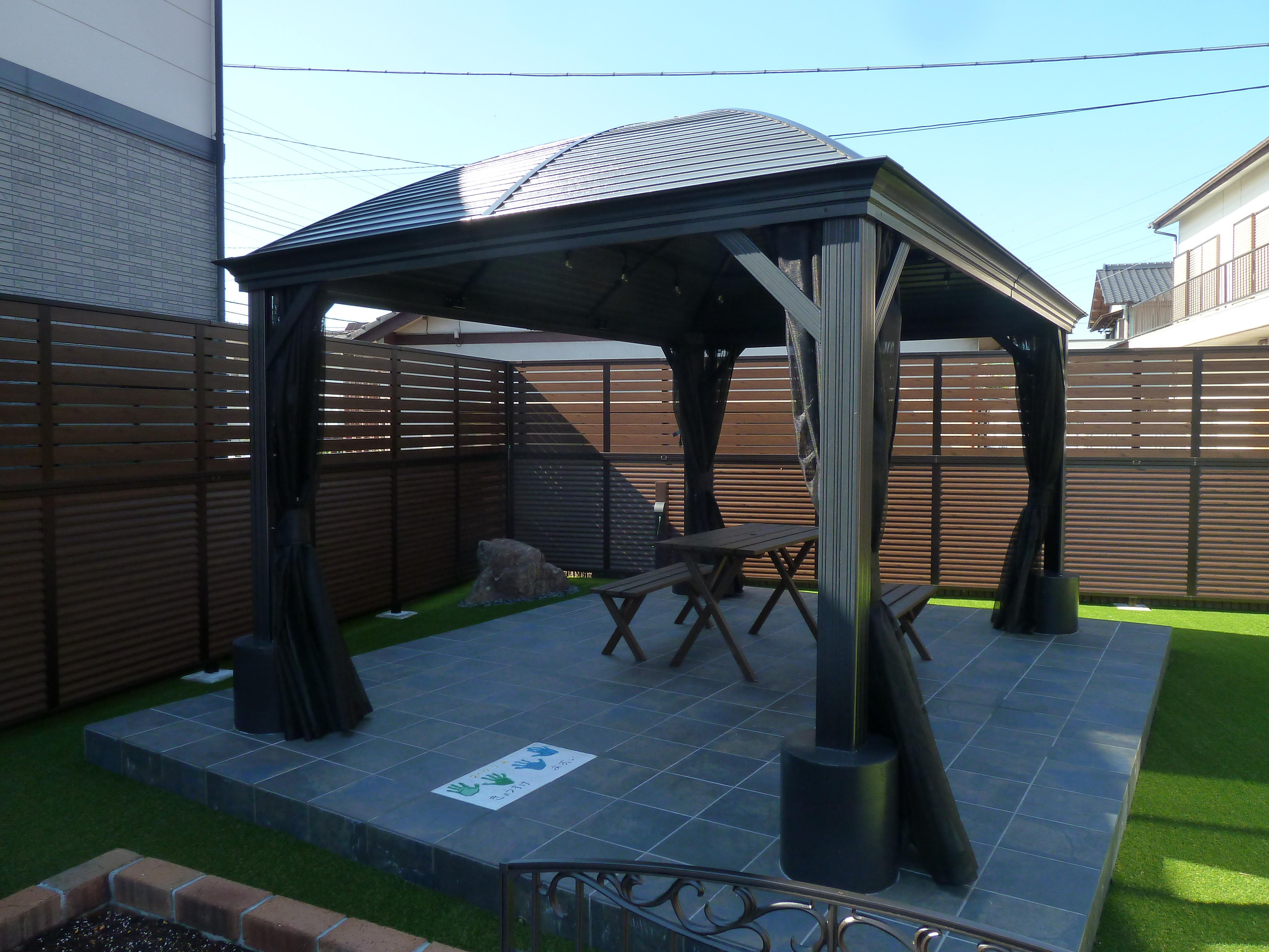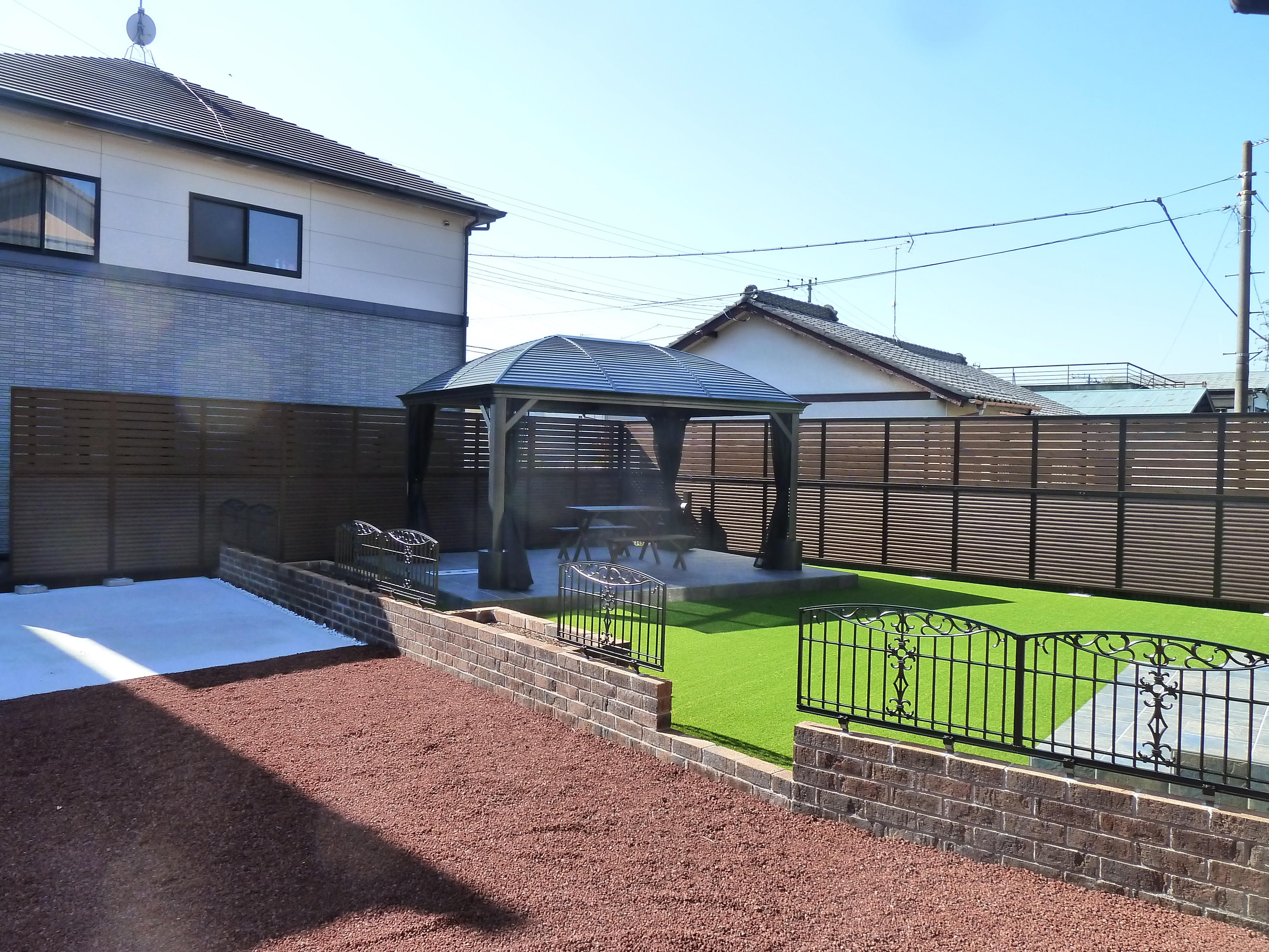 奥様の強い思い『ガゼボのある庭』を実現しました(´▽`) 手のかからない「人工芝」で一年中グリーンが奇麗です(^^)v