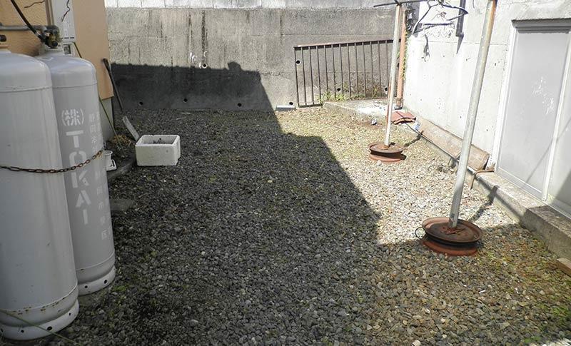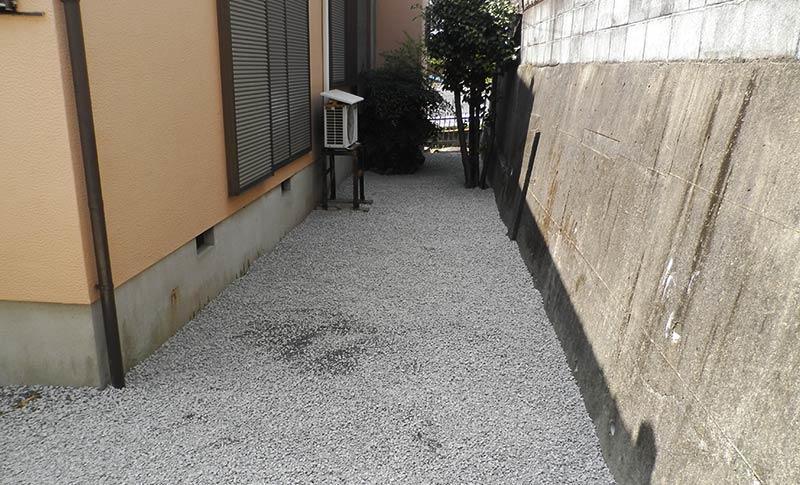まず草を刈り、防草シートを敷き、その上に砂利(6号砕石)を敷き込みました。