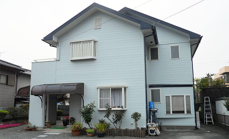 【工事内容】 12mm釘打ちのサイディングの為、一部釘の浮きや外壁のヒビ・反りがありましたので補修し、お客様の要望通り明るい淡いブルー色で塗装、明るく感じの良い外観になりました。