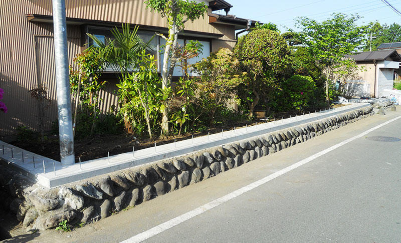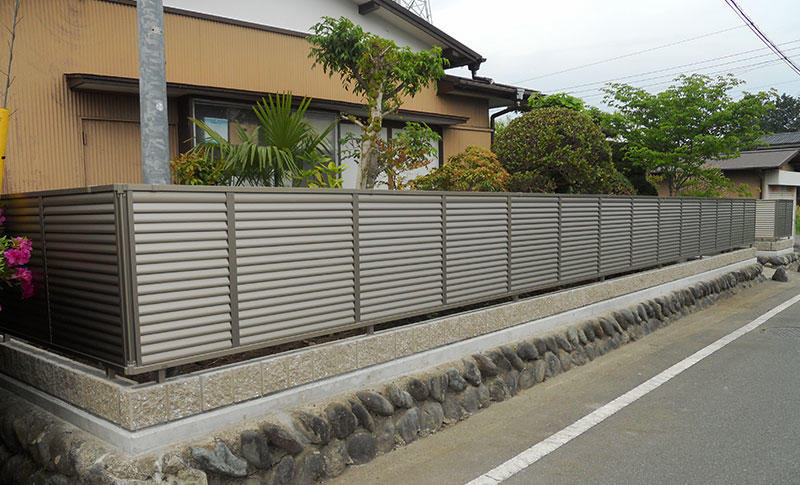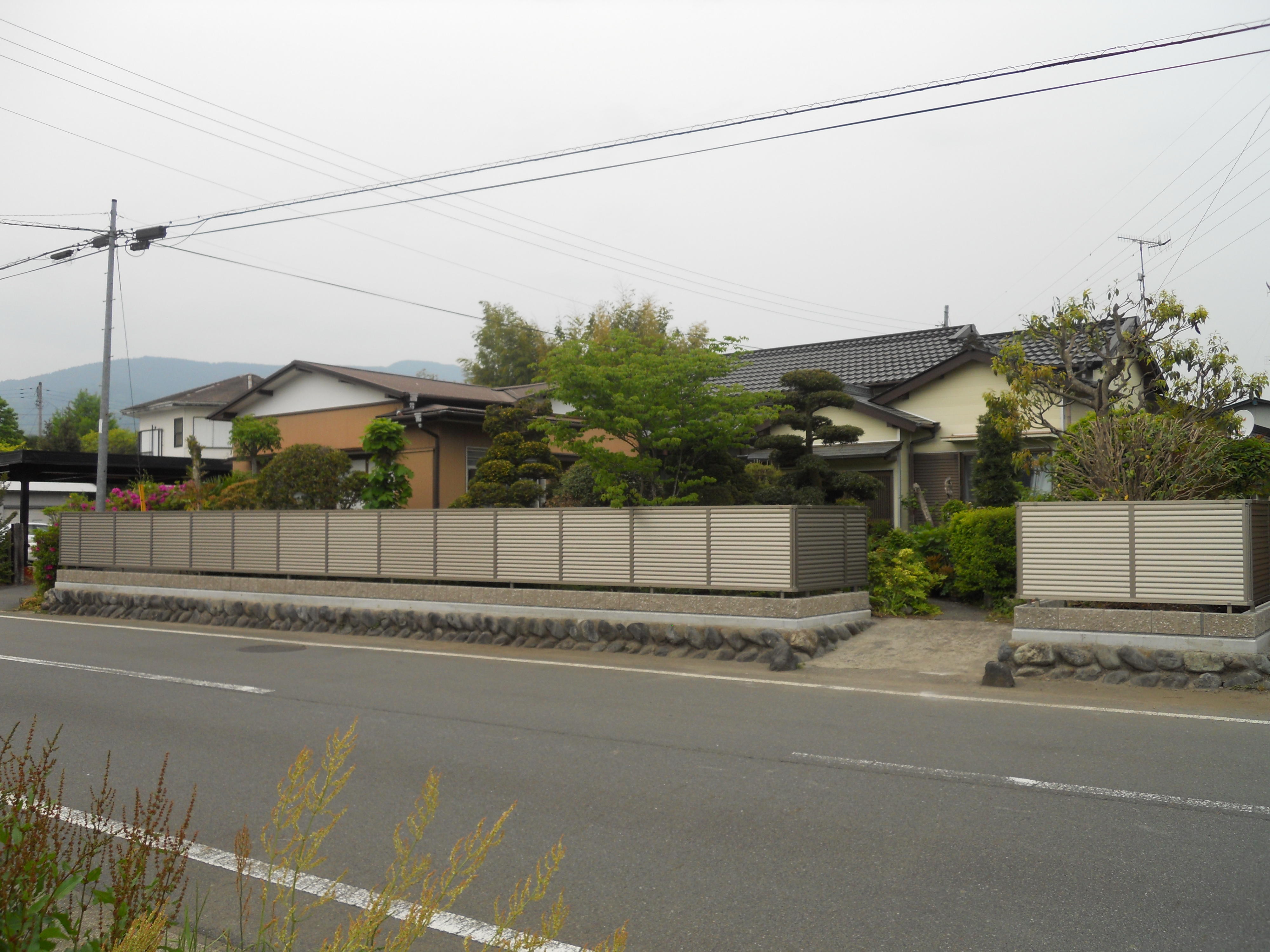 富士宮市へ申請し、ブロック塀撤去補助金対象工事になりました。既設ブロック塀は全て解体処分。石積基礎のため、新設アルミフェンスを取付するにあたり、新規コンクリート基礎を施工し化粧ブロック1段積、新設アルミ目隠しフェンスを取付しました。