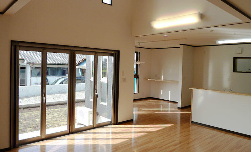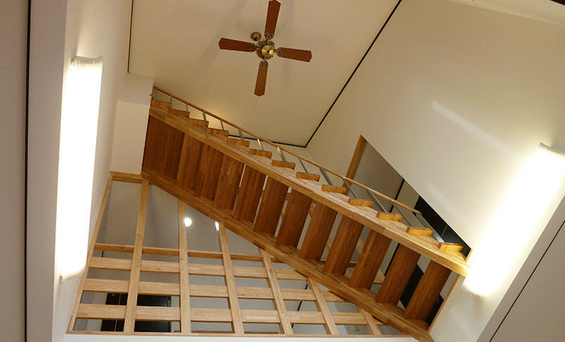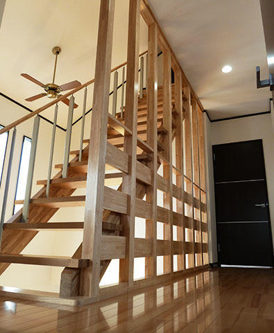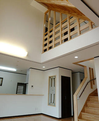 耐震性能を気になさっていたご夫婦に地震エネルギーを吸収し揺れを抑える「制振装置ジオフォルテ」をご提案。大きな吹抜けを見上げると、小屋裏収納への階段の存在感を醸し出してます。キッチンには使いやすい3連IHクッキングヒーターを使用して、奥様の料理を効率よくお手伝い。リビングには全開放出来るサッシでリビングとウッドデッキをつなぎ解放感が倍増。太陽光発電システムを搭載して、家族にも家計にも優しい住まいになっています。