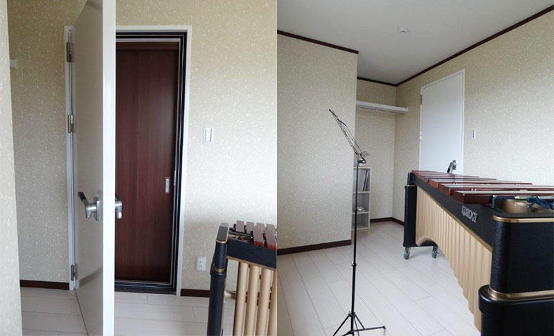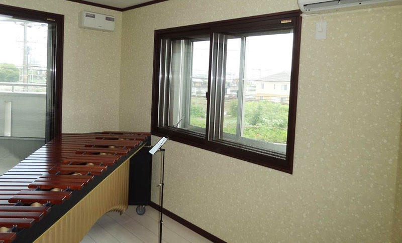 戸建て2階の1部屋をマリンバ演奏用防音室にリフォーム。 防音設計と防音部材の販売をしました。 防振構造でルームインルームに サッシは4重サッシ。 屋外に対して「Dr60」の遮音性能になります。