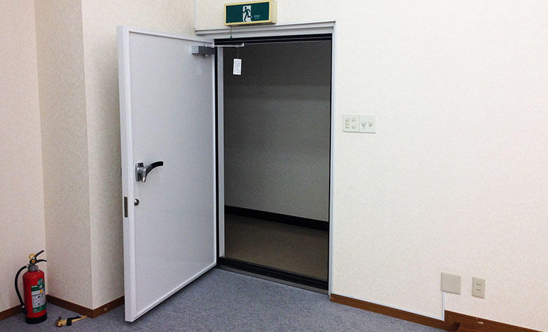 ビルの地下、演劇などを行う多目的ホール出入口のドアを防音ドアに変更しました。