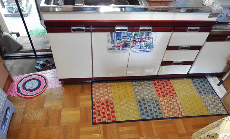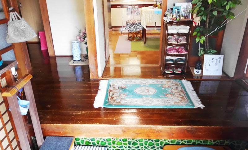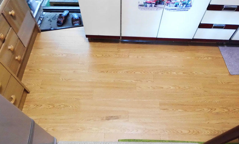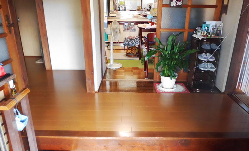 玄関ホールは既存の床上に落ち着いた色合いのフローリングを施工しました。きしみ音は既存の板と板が競りあう音の為、その部分を補修し音を解消しました。台所はキッチン前一部分の床を一度剥ぎ取り、新設ベニヤに取替、仕上げ材は水に強いクッションフロア仕上げにしました。今回の工事にて白蟻駆除も行いましたが、後々白蟻点検が出来る様に床下点検口を設けました。
