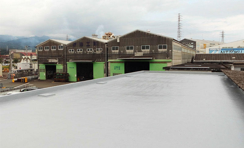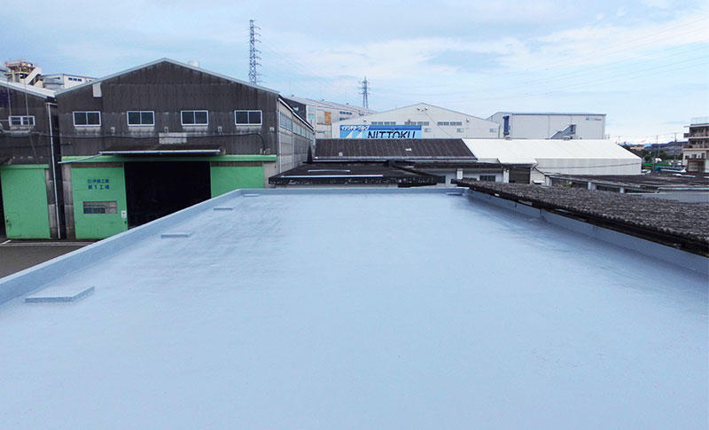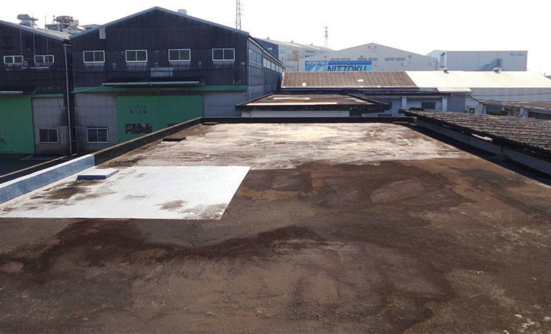 倉庫が古い建物で、メンテナンスもしていなかったため、防水の状態が悪く屋根には亀裂もありました。新規にウレタン塗膜防水を施工。 防水施工前には、事前に高圧洗浄を行い既存の汚れを除去。防水塗布面を綺麗にし、ウレタン塗膜防水を施工。雨漏りがしないようになりました。