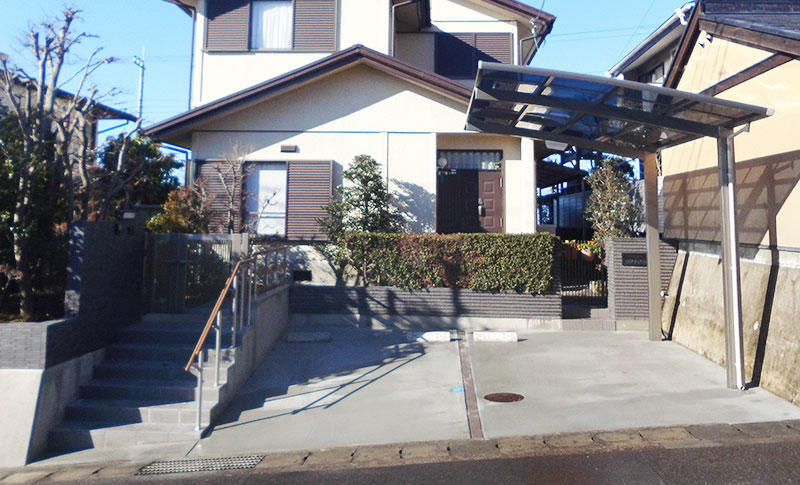 【工事内容】 昔、車が一家に1台の時代に新築した当時は良かったのですが、今では車社会になり1人1台の時代。全体的に車の駐車スペースが狭かったため、駐車スペースを広げることから計画をし直しました。土地の立地条件が傾斜地で、住宅部分が道路面より約1mぐらい高台にあった為、今後高齢時のことを考えスロープにしたかったのですが、勾配がきつく歩くのに困難になりそうなためアプローチ部分は昇降しやすいh150の階段6段(一部w300の滑り止め付)に、車からは玄関に直接行ける2段の階段も設けてあります。手摺りは安全性と機能性、意匠性を兼ね備えた2段手摺りを施工しました。日常歩行しやすい見栄えの良い外構に仕上がりました。