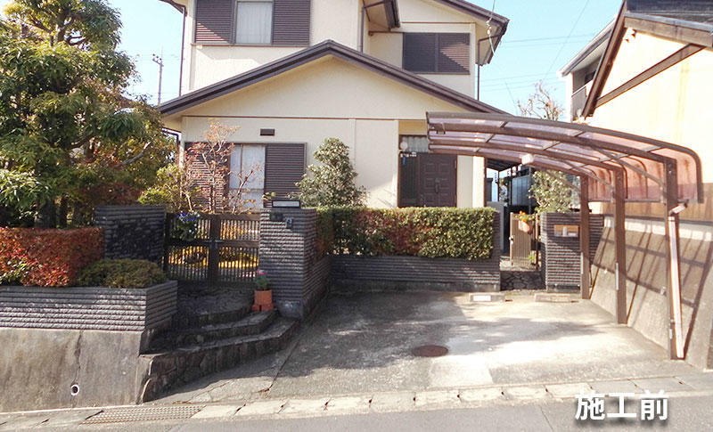 【お客様の要望・現状の不満点】 1.老朽化した外構を全体的に見直したい。 2.車が2台駐車出来ないことはないが、狭い為駐車スペースを広げたい 3.夫婦2人暮らしですが、今後高齢になった時に備えスムーズに歩行しやすいアプローチにしておきたい。